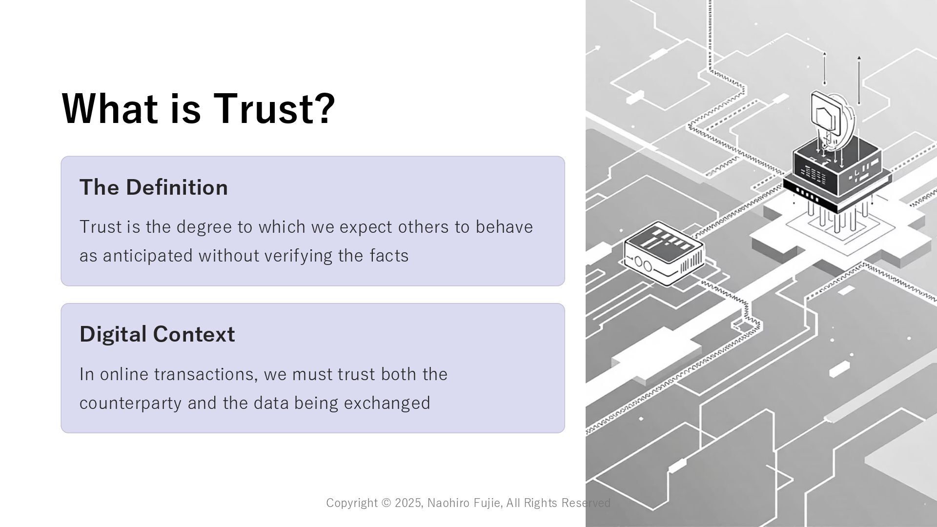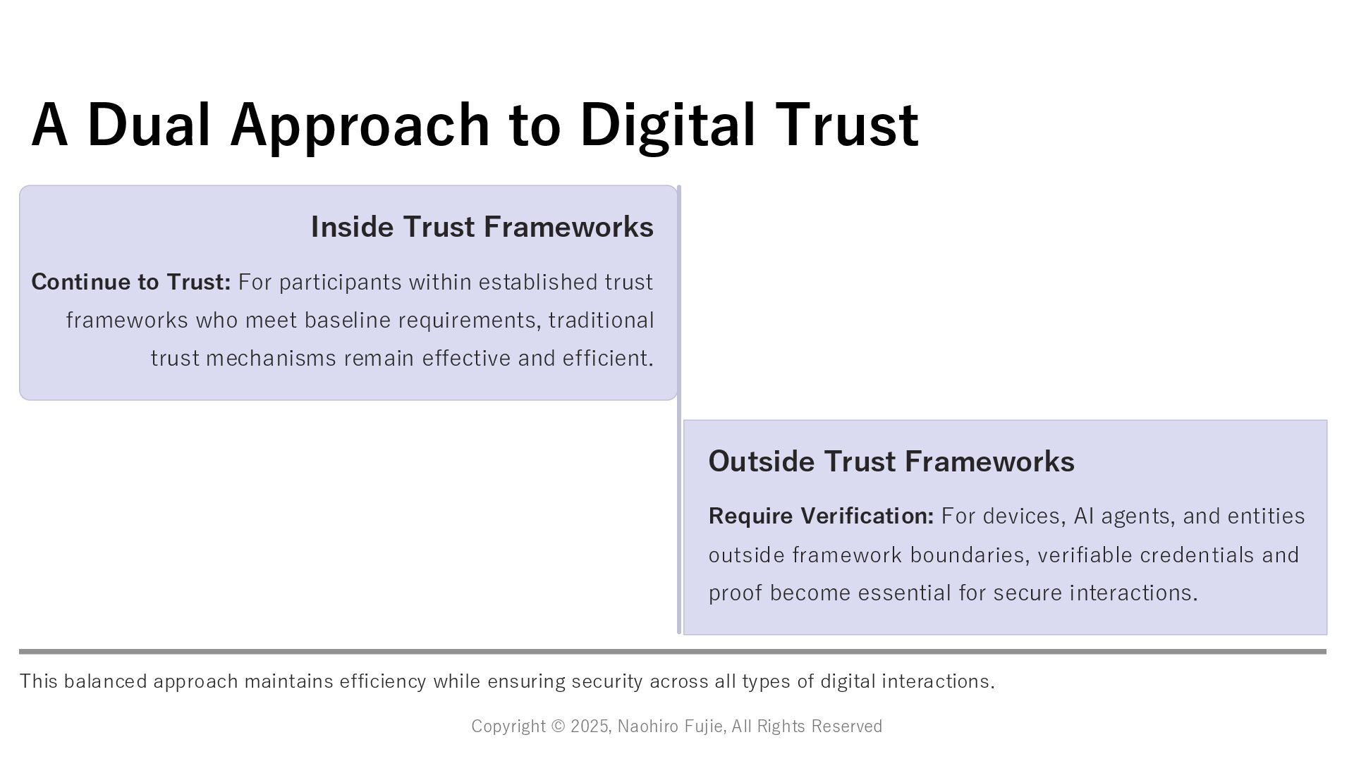 Approach to Digital Trust Inside Trust Frameworks Continue to Trust: For participants within established trust frameworks who meet baseline requirements, traditional trust mechanisms remain effective and efficient. Outside Trust Frameworks Require Verification: For devices, AI agents, and entities outside framework boundaries, verifiable credentials and proof become essential for secure interactions. This balanced approach maintains efficiency while ensuring security across all types of digital interactions.