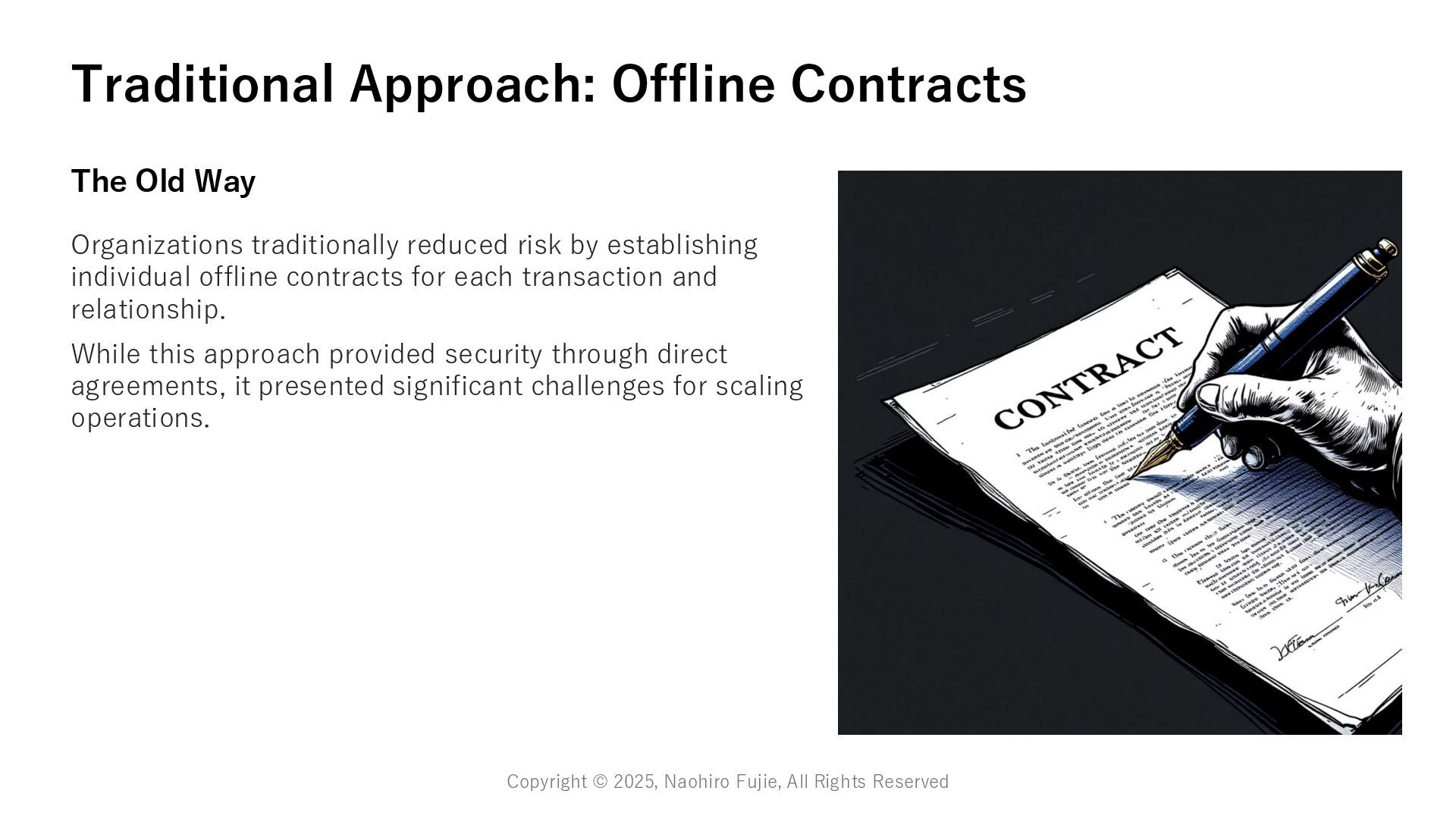 Offline Contracts The Old Way Organizations traditionally reduced risk by establishing individual offline contracts for each transaction and relationship. While this approach provided security through direct agreements, it presented significant challenges for scaling operations.