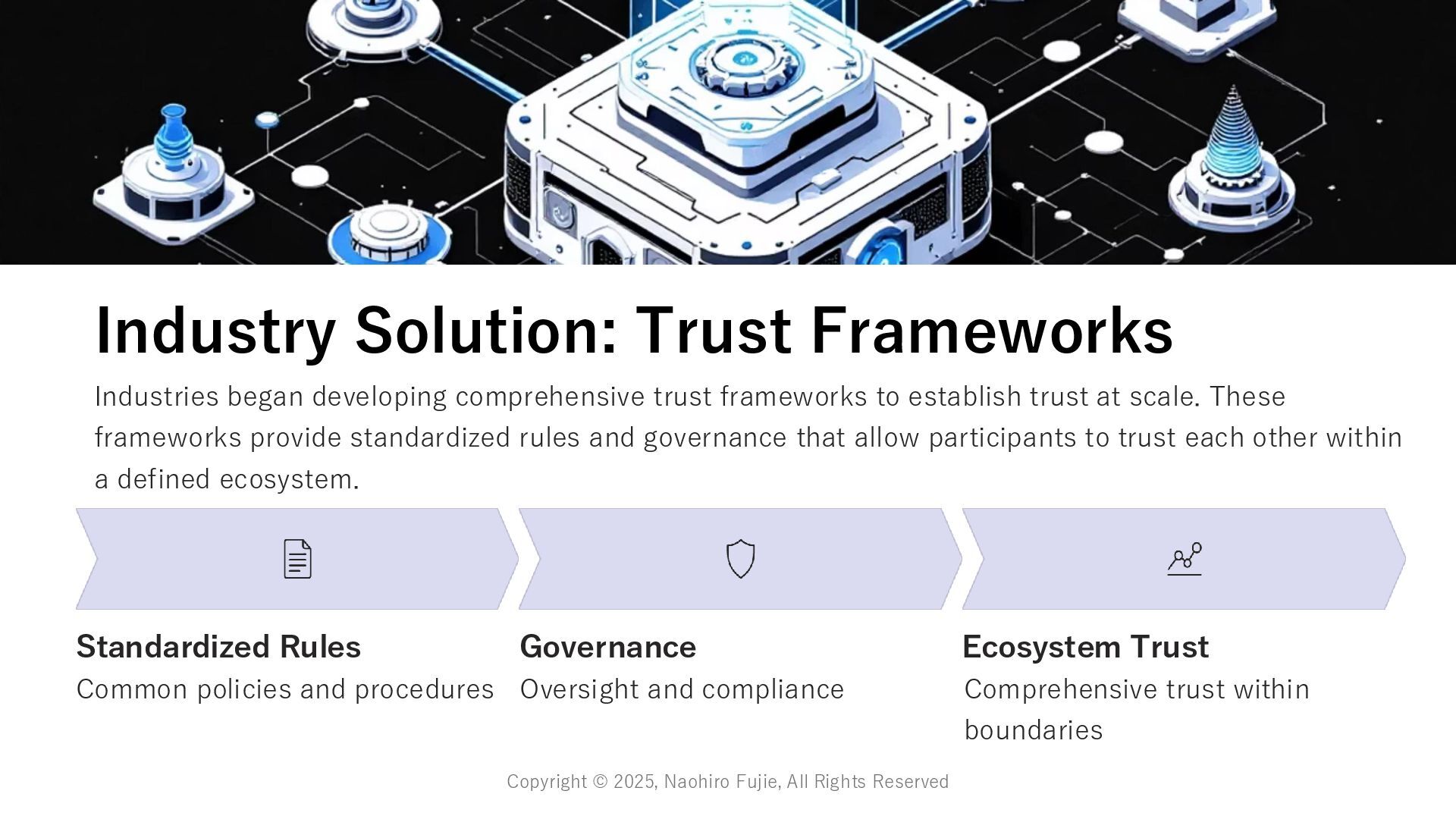 Trust Frameworks Industries began developing comprehensive trust frameworks to establish trust at scale. These frameworks provide standardized rules and governance that allow participants to trust each other within a defined ecosystem. Standardized Rules Common policies and procedures Governance Oversight and compliance Ecosystem Trust Comprehensive trust within boundaries