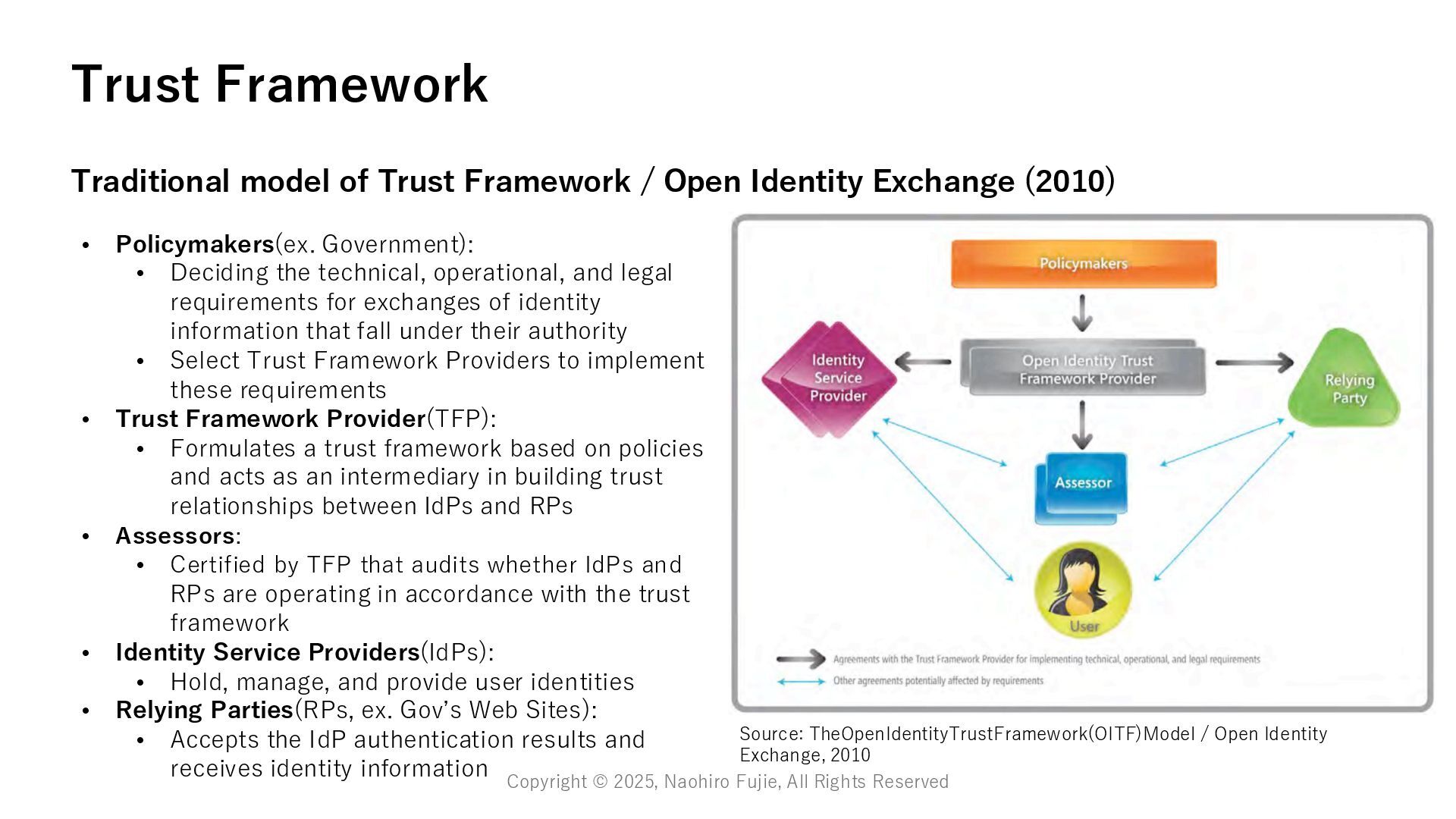 Traditional model of Trust Framework / Open Identity Exchange (2010) Source: TheOpenIdentityTrustFramework(OITF)Model / Open Identity Exchange, 2010 • Policymakers(ex. Government): • Deciding the technical, operational, and legal requirements for exchanges of identity information that fall under their authority • Select Trust Framework Providers to implement these requirements • Trust Framework Provider(TFP): • Formulates a trust framework based on policies and acts as an intermediary in building trust relationships between IdPs and RPs • Assessors: • Certified by TFP that audits whether IdPs and RPs are operating in accordance with the trust framework • Identity Service Providers(IdPs): • Hold, manage, and provide user identities • Relying Parties(RPs, ex. Gov’s Web Sites): • Accepts the IdP authentication results and receives identity information