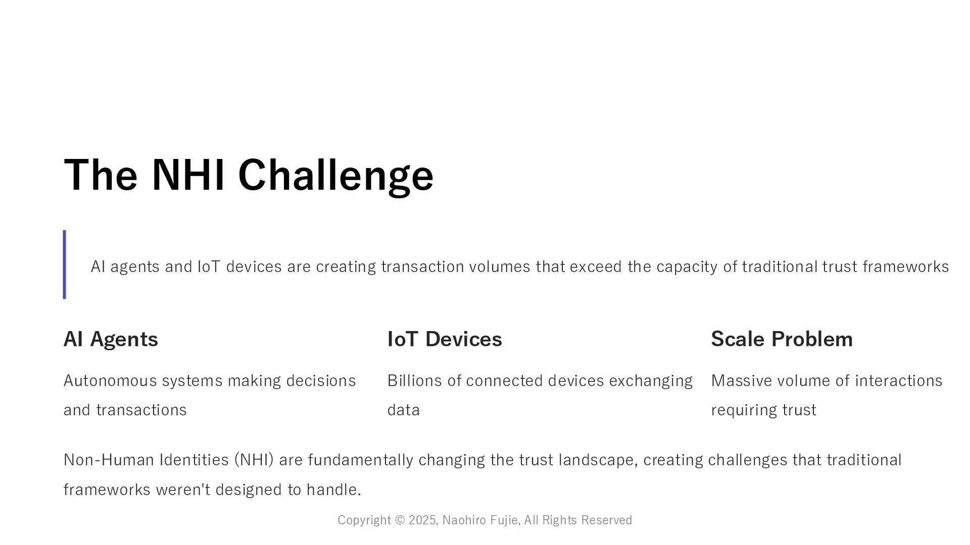 Challenge AI agents and IoT devices are creating transaction volumes that exceed the capacity of traditional trust frameworks AI Agents Autonomous systems making decisions and transactions IoT Devices Billions of connected devices exchanging data Scale Problem Massive volume of interactions requiring trust Non-Human Identities (NHI) are fundamentally changing the trust landscape, creating challenges that traditional frameworks weren't designed to handle.