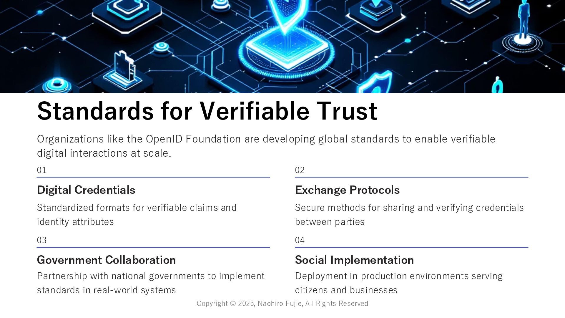 Verifiable Trust Organizations like the OpenID Foundation are developing global standards to enable verifiable digital interactions at scale. 01 Digital Credentials Standardized formats for verifiable claims and identity attributes 02 Exchange Protocols Secure methods for sharing and verifying credentials between parties 03 Government Collaboration Partnership with national governments to implement standards in real-world systems 04 Social Implementation Deployment in production environments serving citizens and businesses