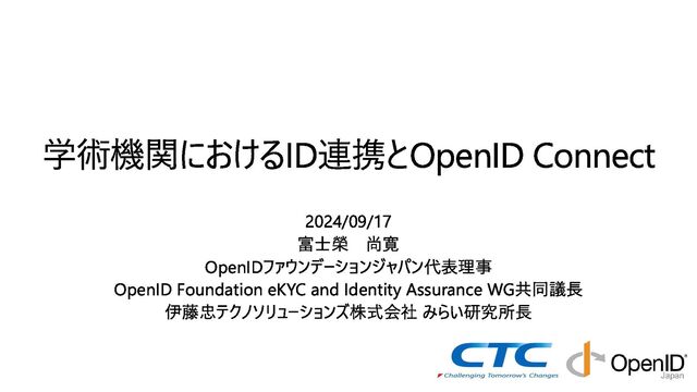 学術機関におけるID連携とOpenID Connect 2024/09/17 富士榮 尚寛 OpenIDファウンデーションジャパン代表理事 OpenID Foundation eKYC and