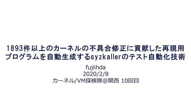 2019/06/05 03:53:20 loading corpus... 2019/06/05 03:53:20 serving http on http://127.0.0.1:56741 2019/06/05 03:53:20 serving rpc on tcp://[::]:37545 2019/06/05 03:53:20 booting test machines... 2019/06/05 03:53:20 wait for the connection from test machine... 2019/06/05 03:54:08 machine check: 2019/06/05 03:54:08 syscalls : 1380/2699 2019/06/05 03:54:08 code coverage : enabled 2019/06/05 03:54:08 comparison tracing : CONFIG_KCOV_ENABLE_COMPARISONS is not enabled 2019/06/05 03:54:08 extra coverage : extra coverage is not supported by the kernel 2019/06/05 03:54:08 setuid sandbox : enabled 2019/06/05 03:54:08 namespace sandbox : /proc/self/ns/user does not exist 2019/06/05 03:54:08 Android sandbox : /sys/fs/selinux/policy does not exist 2019/06/05 03:54:08 fault injection : CONFIG_FAULT_INJECTION is not enabled 2019/06/05 03:54:08 leak checking : CONFIG_DEBUG_KMEMLEAK is not enabled 2019/06/05 03:54:08 net packet injection : /dev/net/tun does not exist 2019/06/05 03:54:08 net device setup : enabled 2019/06/05 03:54:08 corpus : 3844 (0 deleted) 2019/06/05 03:54:10 VMs 4, executed 0, cover 0, crashes 0, repro 0 2019/06/05 03:54:20 VMs 4, executed 36, cover 3836, crashes 0, repro 0 2019/06/05 03:54:30 VMs 4, executed 776, cover 20662, crashes 0, repro 0 (中略) 2019/06/05 04:10:00 VMs 4, executed 70734, cover 62967, crashes 0, repro 0 2019/06/05 04:10:05 vm-3: crash: no output from test machine 2019/06/05 04:10:10 VMs 3, executed 70918, cover 62967, crashes 1, repro 0 (中略) 2019/06/05 04:14:02 VMs 4, executed 87377, cover 63959, crashes 1, repro 0 2019/06/05 04:14:05 vm-2: crash: no output from test machine 2019/06/05 04:14:12 VMs 3, executed 87614, cover 63960, crashes 2, repro 0 (中略) 2019/06/05 04:14:32 VMs 4, executed 87978, cover 63995, crashes 2, repro 0 2019/06/05 04:14:40 vm-3: crash: KASAN: use-after-free Read in blk_mq_free_rqs 2019/06/05 04:14:41 vm-1: running for 20m42.241115632s, restarting 2019/06/05 04:14:41 vm-0: running for 20m33.97704277s, restarting 2019/06/05 04:14:41 vm-2: running for 9.643775512s, restarting 2019/06/05 04:14:42 reproducing crash 'KASAN: use-after-free Read in blk_mq_free_rqs': 1158 programs, 4 VMs, timeouts [15s 1m0s 6m0s] 2019/06/05 04:14:42 VMs 0, executed 87978, cover 63995, crashes 3, repro 1 (繰り返す) 起動からわずか 20 分程で不具合 らしいものを発⾒ クラッシュ時に 事象を取り逃す こともある 同上 再現を試みる