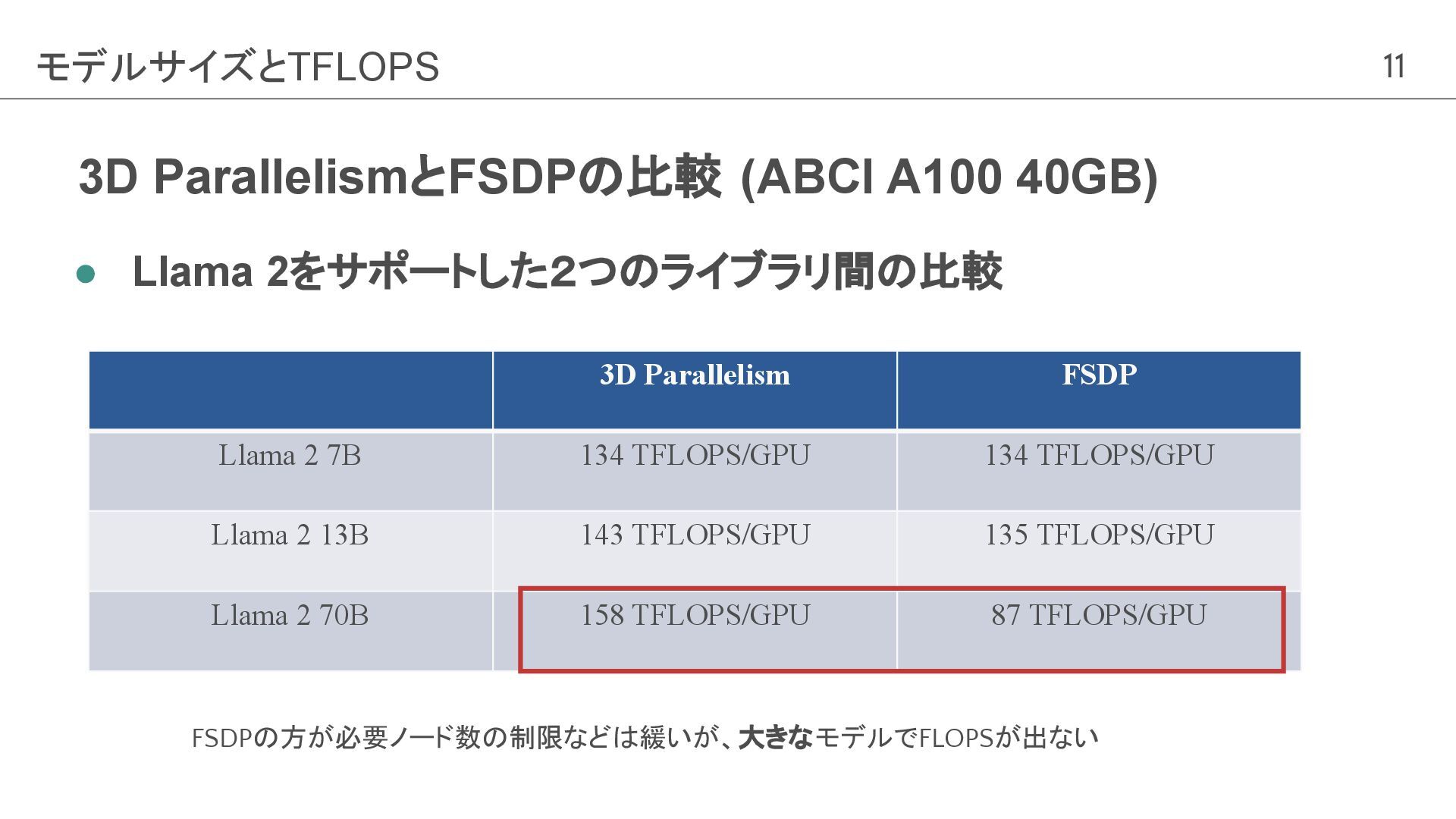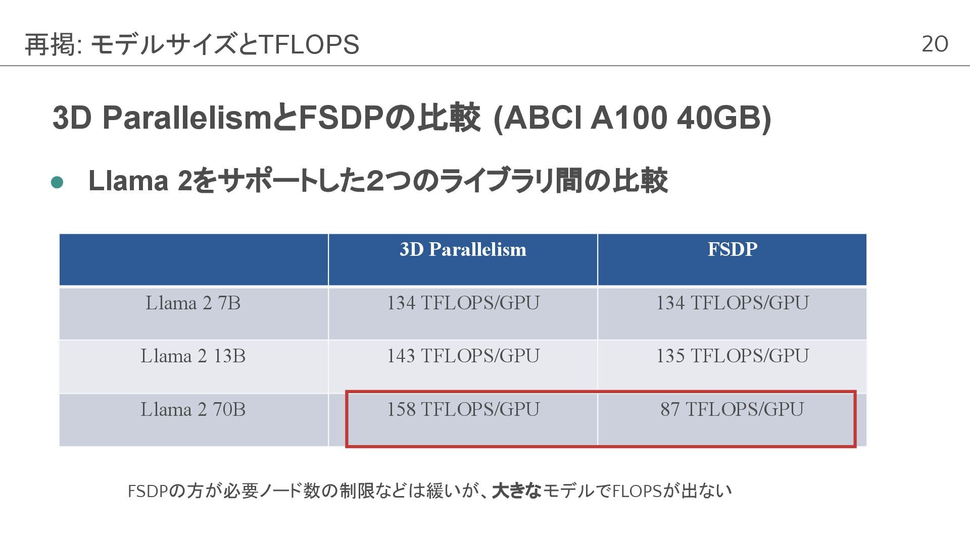 3D Parallelism FSDP Llama 2 7B 134 TFLOPS/GPU 134 TFLOPS/GPU Llama 2 13B 143 TFLOPS/GPU 135 TFLOPS/GPU Llama 2 70B 158 TFLOPS/GPU 87 TFLOPS/GPU FSDPの方が必要ノード数の制限などは緩いが、大きなモデルでFLOPSが出ない