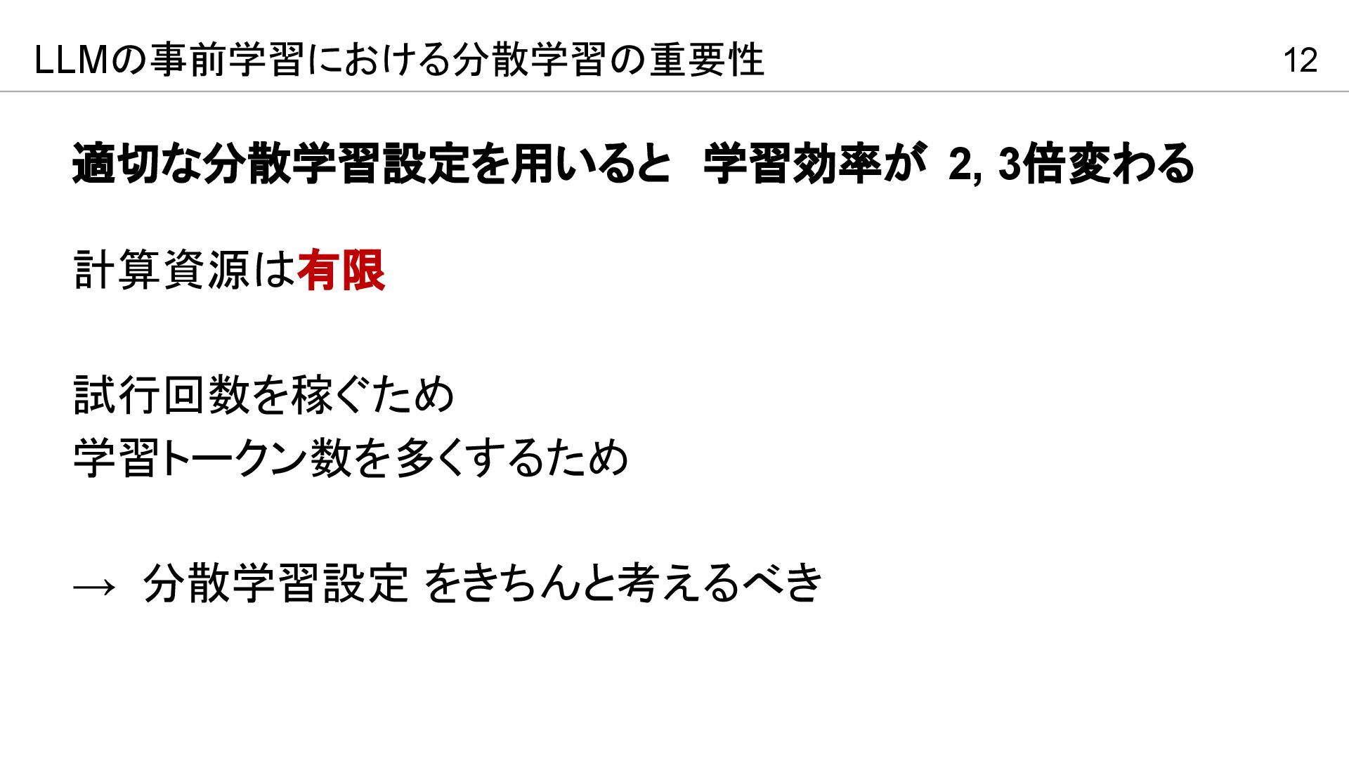 12 LLMの事前学習における分散学習の重要性 適切な分散学習設定を用いると 学習効率が 2, 3倍変わる 計算資源は有限 試行回数を稼ぐため 学習トークン数を多くするため →