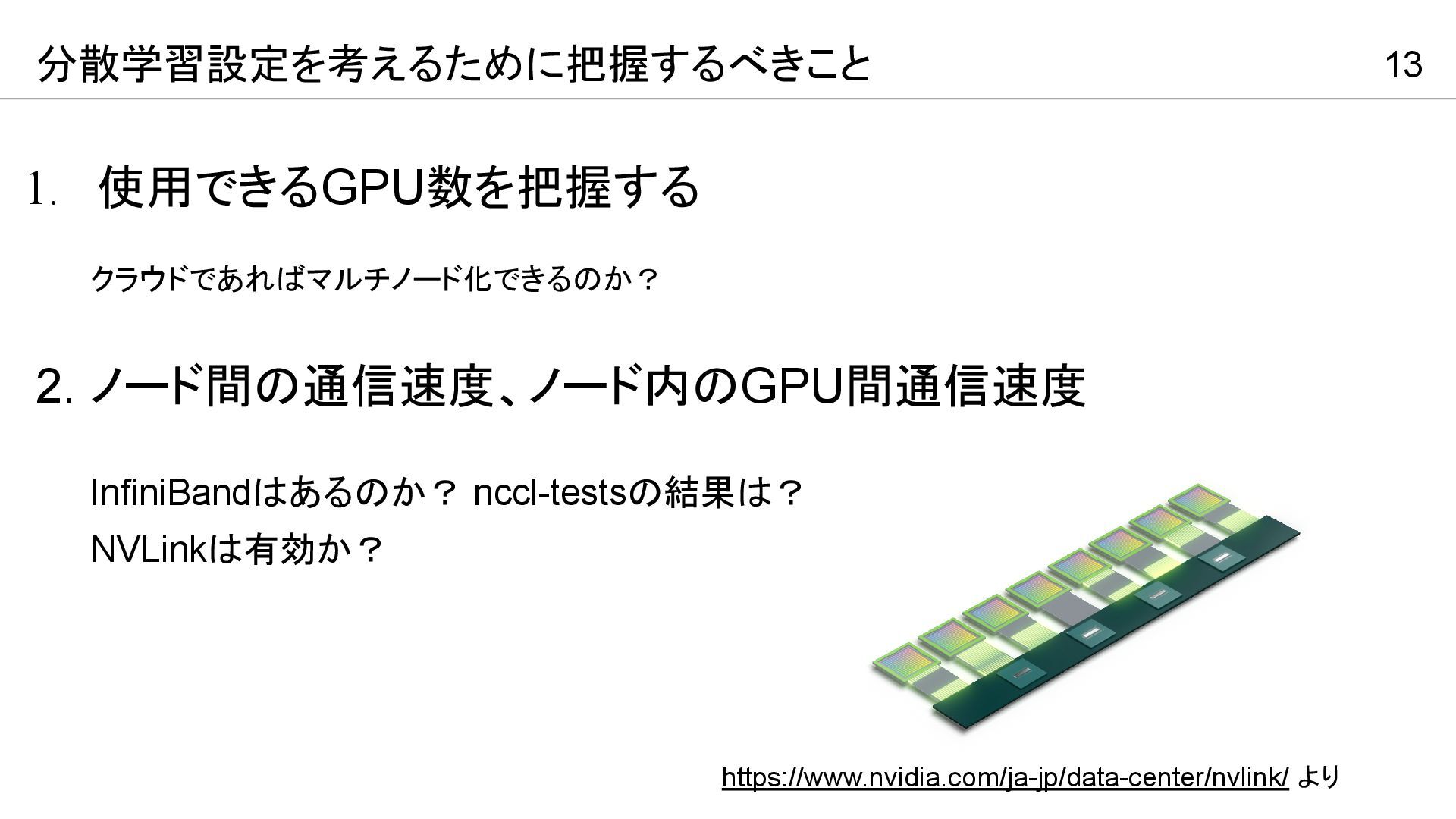 13 分散学習設定を考えるために把握するべきこと 1. 使用できるGPU数を把握する クラウドであればマルチノード化できるのか? 2. ノード間の通信速度、ノード内のGPU間通信速度 InfiniBandはあるのか? nccl-testsの結果は? NVLinkは有効か?