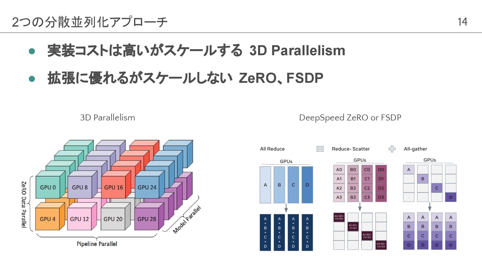 14 2つの分散並列化アプローチ 3D Parallelism DeepSpeed ZeRO or FSDP • 実装コストは高いがスケールする