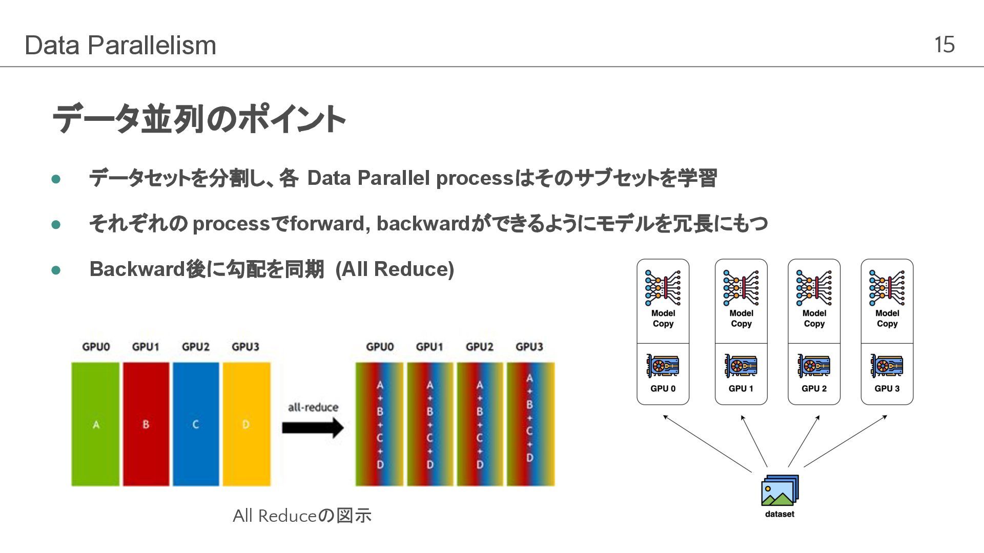 それぞれの processでforward, backwardができるようにモデルを冗長にもつ • Backward後に勾配を同期 (All Reduce) All Reduceの図示