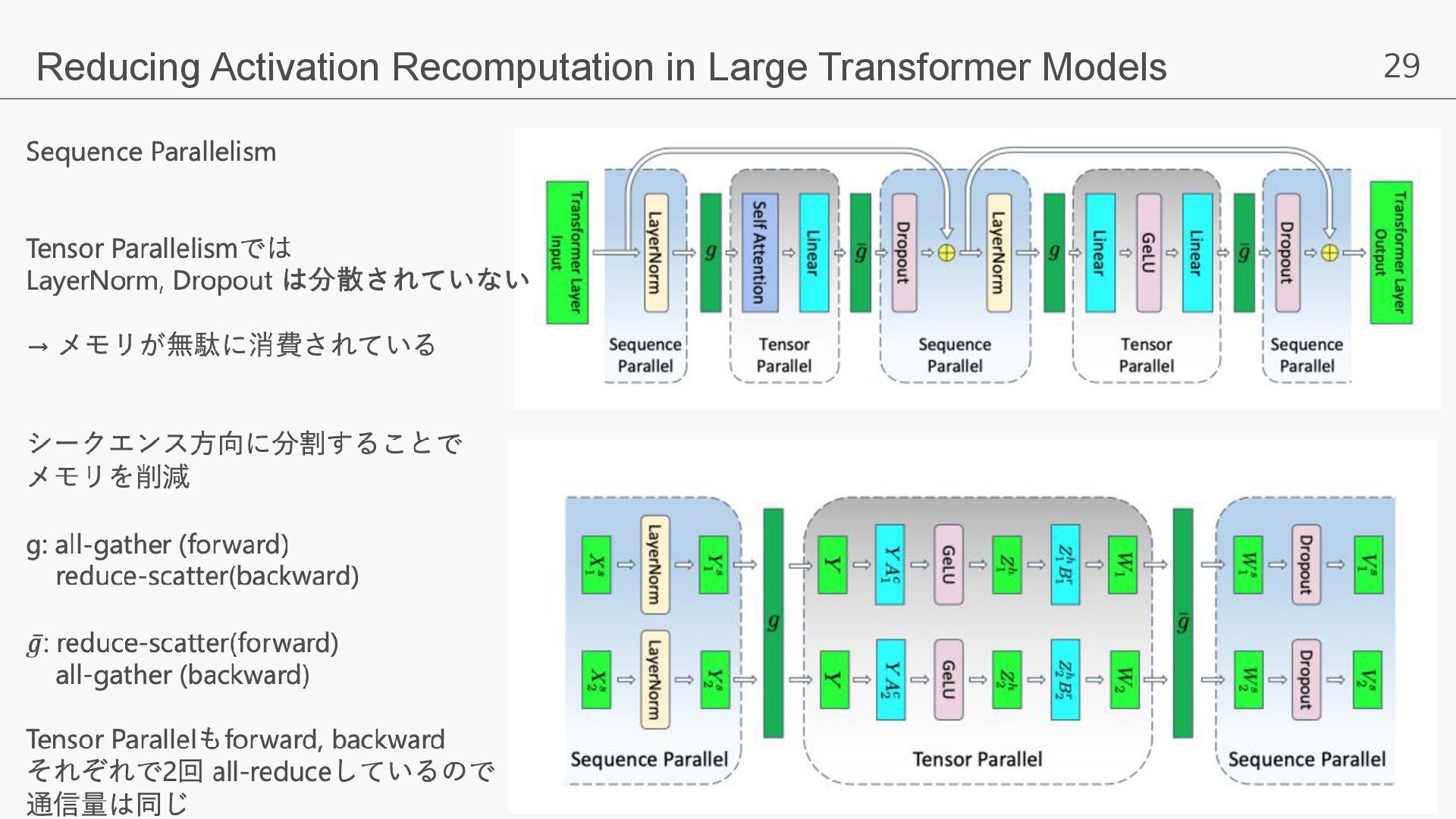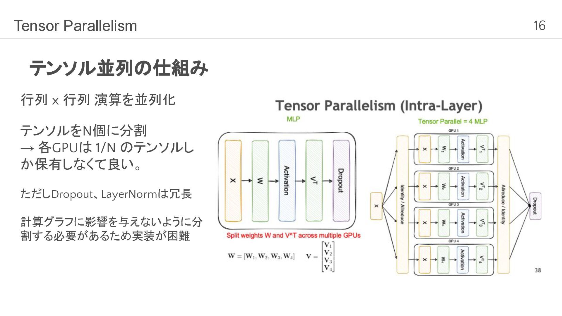 is Worth 16x16 Words: Transformers for Image Recognition at Scale” 行列 x 行列 演算を並列化 テンソルをN個に分割 → 各GPUは 1/N のテンソルし か保有しなくて良い。 ただしDropout、LayerNormは冗長 計算グラフに影響を与えないように分 割する必要があるため実装が困難