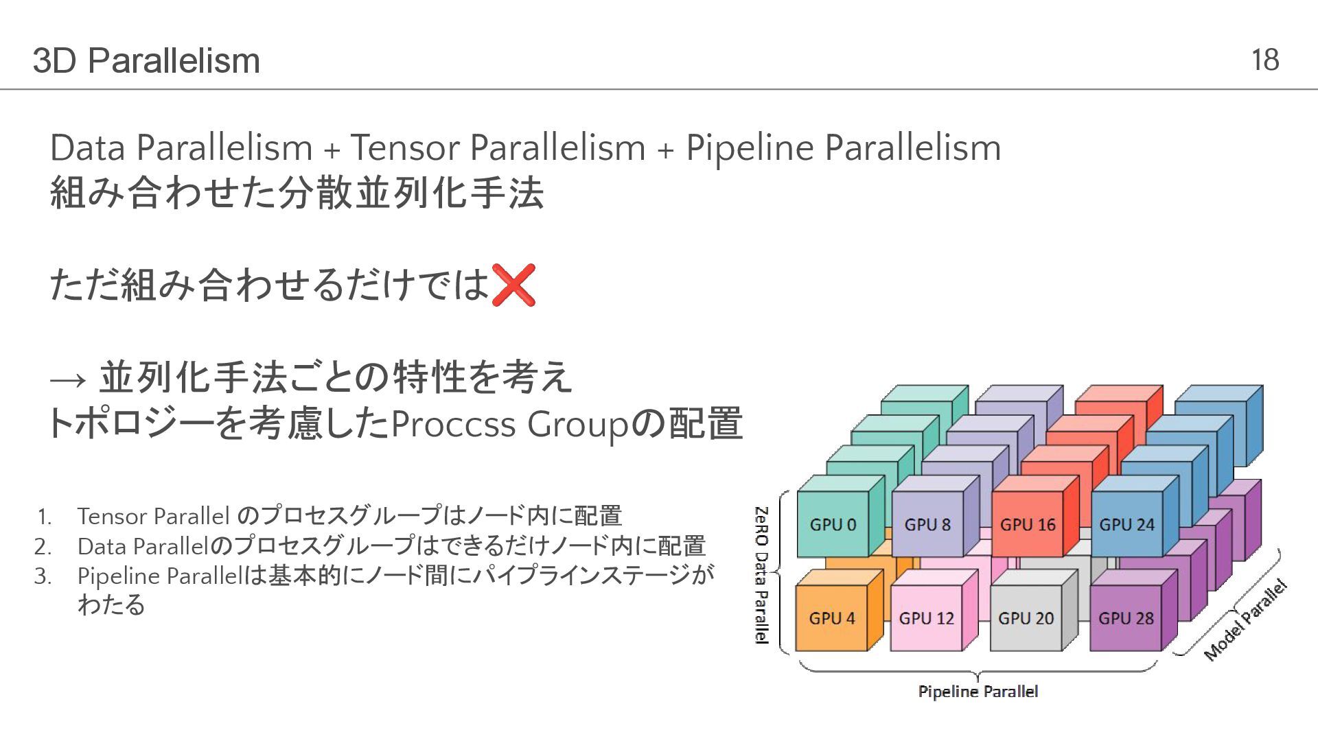 Parallelism 組み合わせた分散並列化手法 ただ組み合わせるだけでは❌ → 並列化手法ごとの特性を考え トポロジーを考慮したProccss Groupの配置 1. Tensor Parallel のプロセスグループはノード内に配置 2. Data Parallelのプロセスグループはできるだけノード内に配置 3. Pipeline Parallelは基本的にノード間にパイプラインステージが わたる