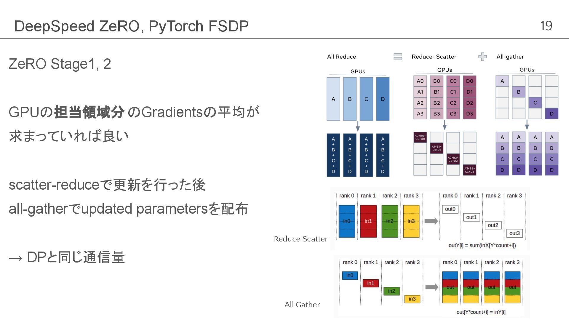 19 DeepSpeed ZeRO, PyTorch FSDP ZeRO Stage1, 2 GPUの担当領域分 のGradientsの平均が