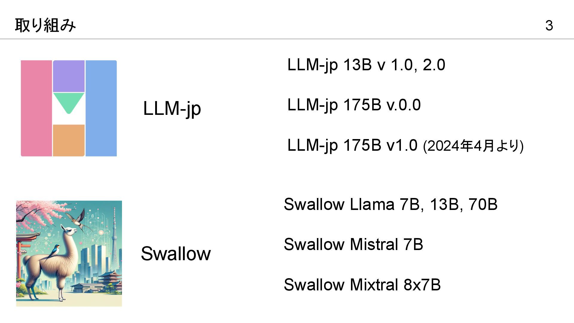 3 取り組み LLM-jp Swallow LLM-jp 13B v 1.0, 2.0 LLM-jp
