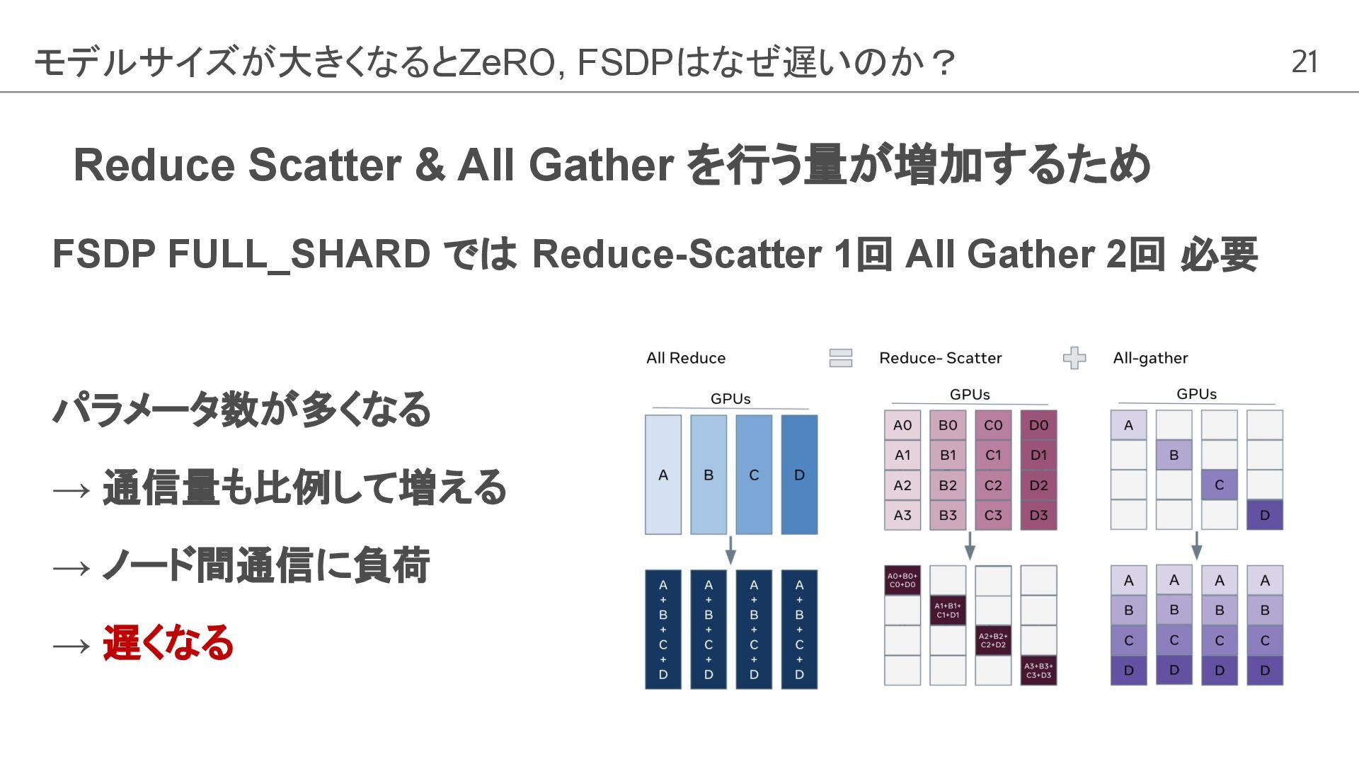 Reduce-Scatter 1回 All Gather 2回 必要 パラメータ数が多くなる → 通信量も比例して増える → ノード間通信に負荷 → 遅くなる モデルサイズが大きくなるとZeRO, FSDPはなぜ遅いのか?