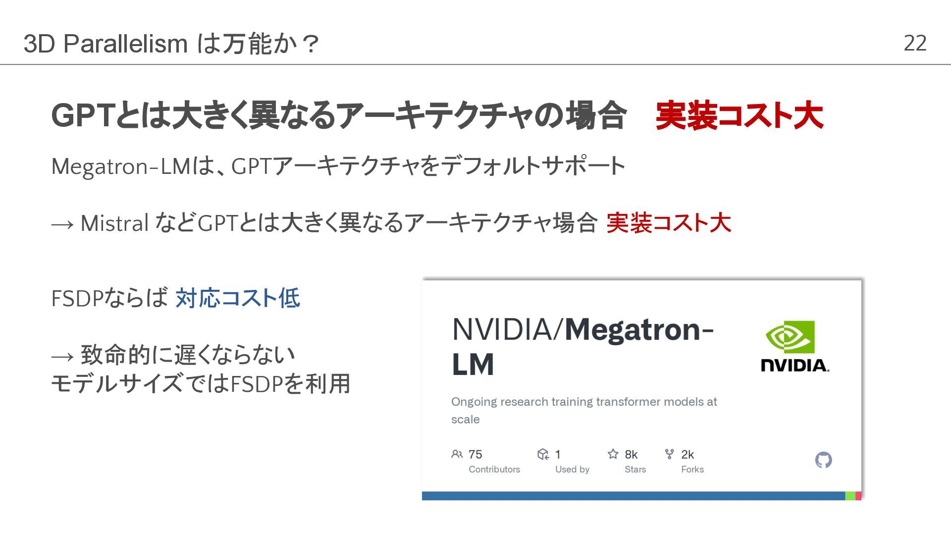 22 GPTとは大きく異なるアーキテクチャの場合 実装コスト大 3D Parallelism は万能か? Megatron-LMは、GPTアーキテクチャをデフォルトサポート → Mistral などGPTとは大きく異なるアーキテクチャ場合