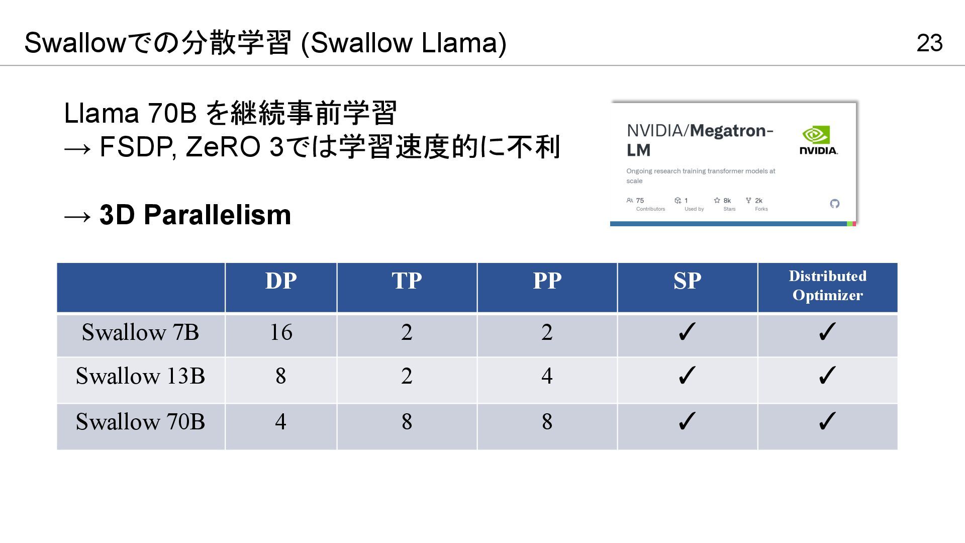 23 Swallowでの分散学習 (Swallow Llama) DP TP PP SP Distributed Optimizer