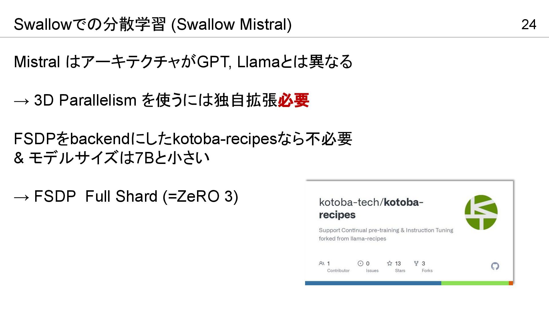 24 Swallowでの分散学習 (Swallow Mistral) Mistral はアーキテクチャがGPT, Llamaとは異なる → 3D Parallelism