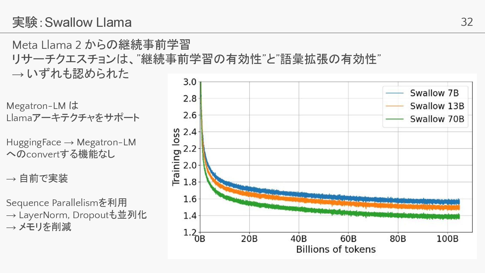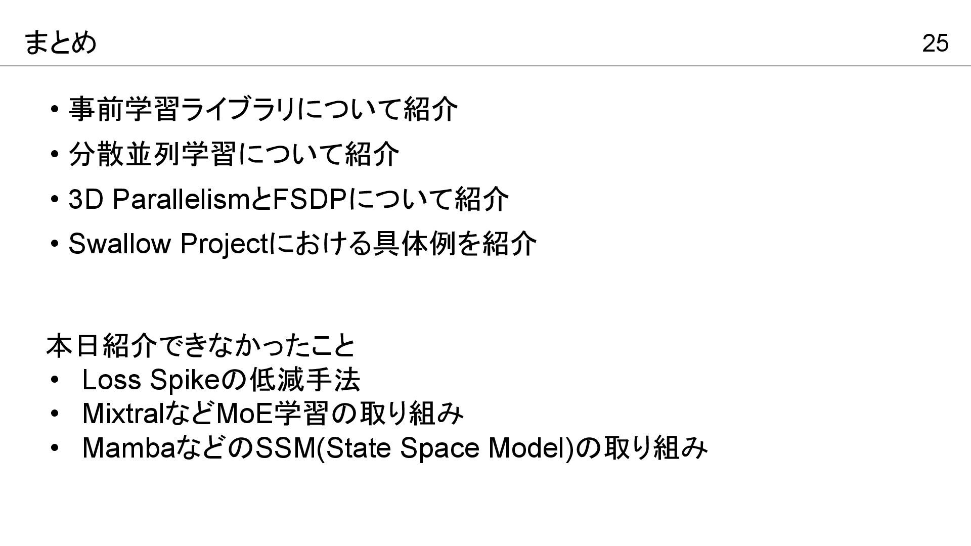 Swallow Projectにおける具体例を紹介 本日紹介できなかったこと • Loss Spikeの低減手法 • MixtralなどMoE学習の取り組み • MambaなどのSSM(State Space Model)の取り組み