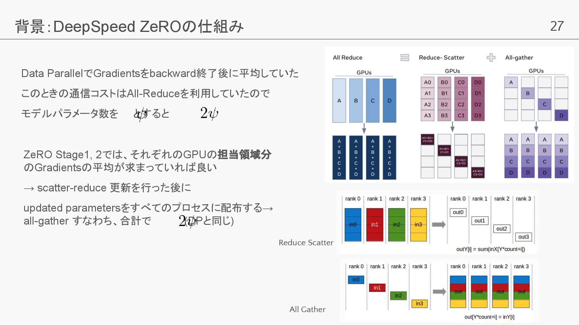 27 背景:DeepSpeed ZeROの仕組み Data ParallelでGradientsをbackward終了後に平均していた このときの通信コストはAll-Reduceを利用していたので モデルパラメータ数を とすると ZeRO Stage1, 2では、それぞれのGPUの担当領域分