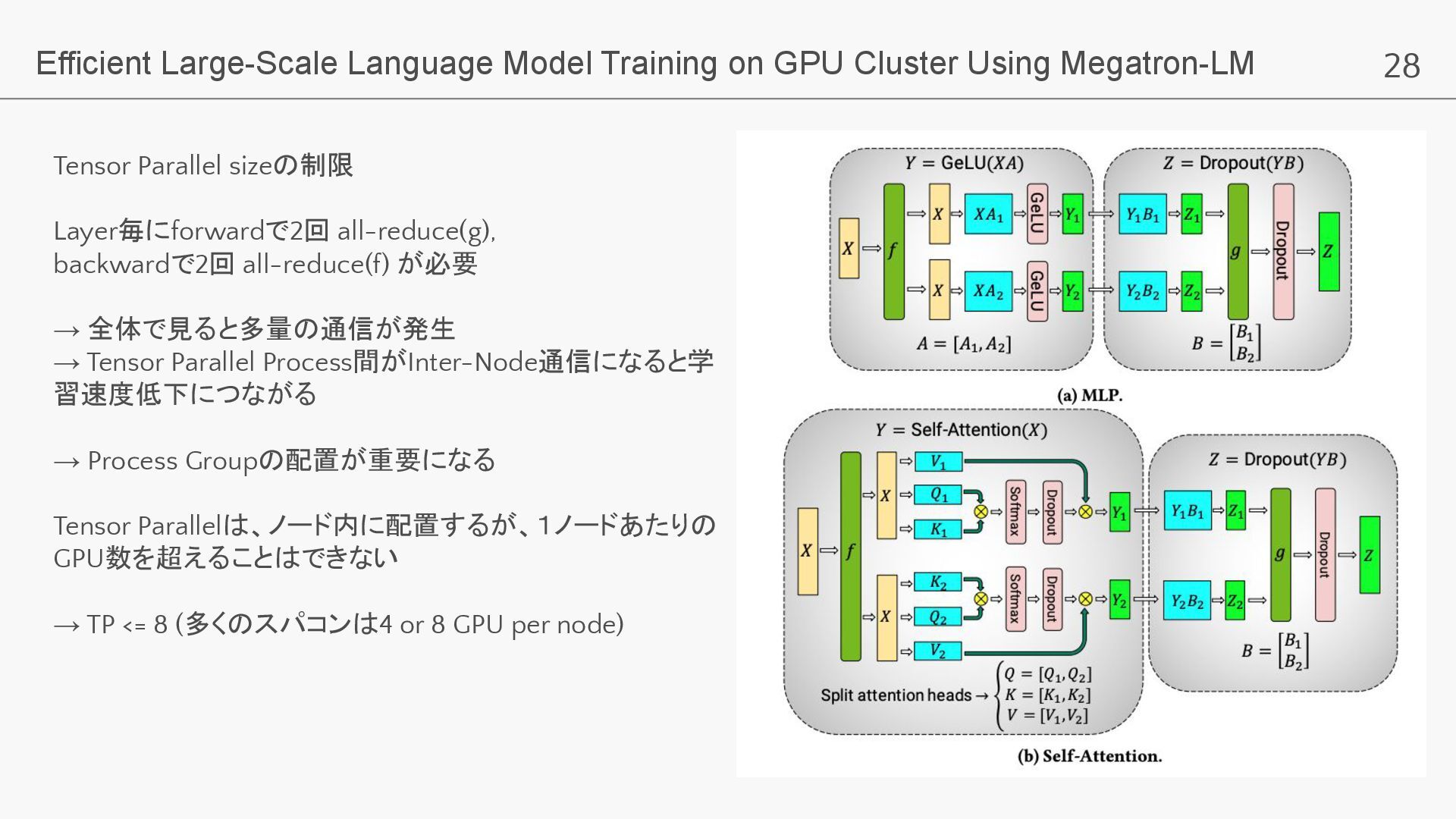 Megatron-LM Tensor Parallel sizeの制限 Layer毎にforwardで2回 all-reduce(g), backwardで2回 all-reduce(f) が必要 → 全体で見ると多量の通信が発生 → Tensor Parallel Process間がInter-Node通信になると学 習速度低下につながる → Process Groupの配置が重要になる Tensor Parallelは、ノード内に配置するが、1ノードあたりの GPU数を超えることはできない → TP <= 8 (多くのスパコンは4 or 8 GPU per node)