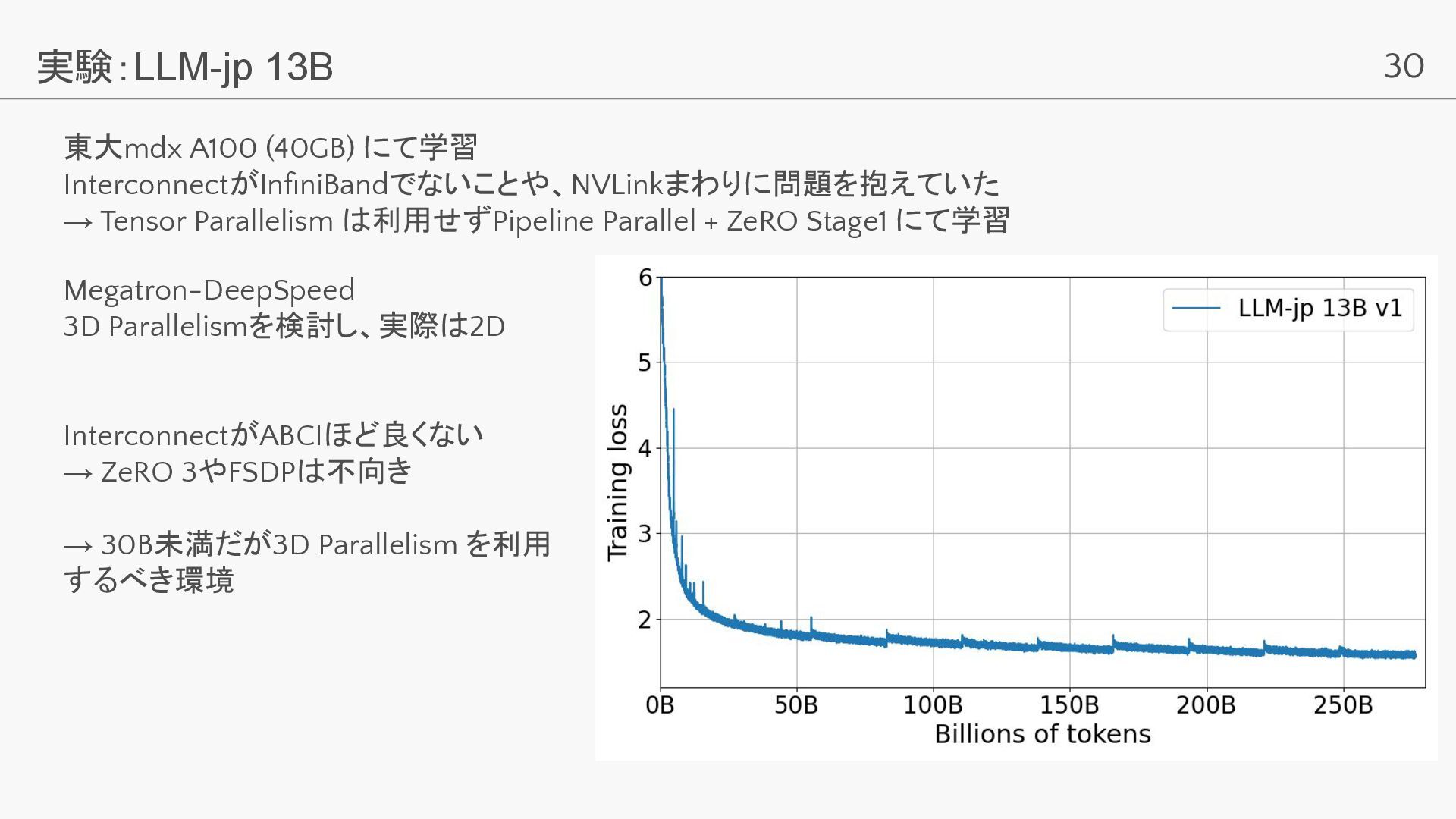 30 実験:LLM-jp 13B 東大mdx A100 (40GB) にて学習 InterconnectがInfiniBandでないことや、NVLinkまわりに問題を抱えていた → Tensor