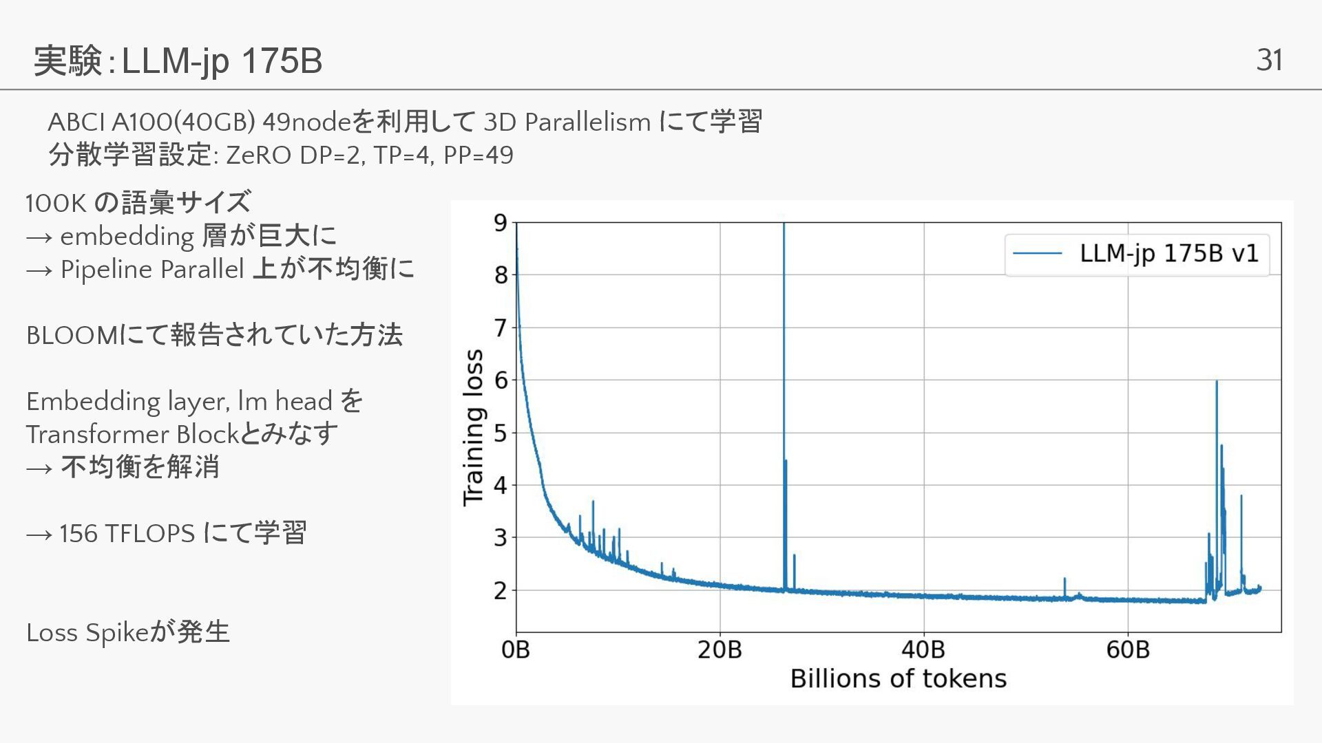 ZeRO DP=2, TP=4, PP=49 100K の語彙サイズ → embedding 層が巨大に → Pipeline Parallel 上が不均衡に BLOOMにて報告されていた方法 Embedding layer, lm head を Transformer Blockとみなす → 不均衡を解消 → 156 TFLOPS にて学習 Loss Spikeが発生