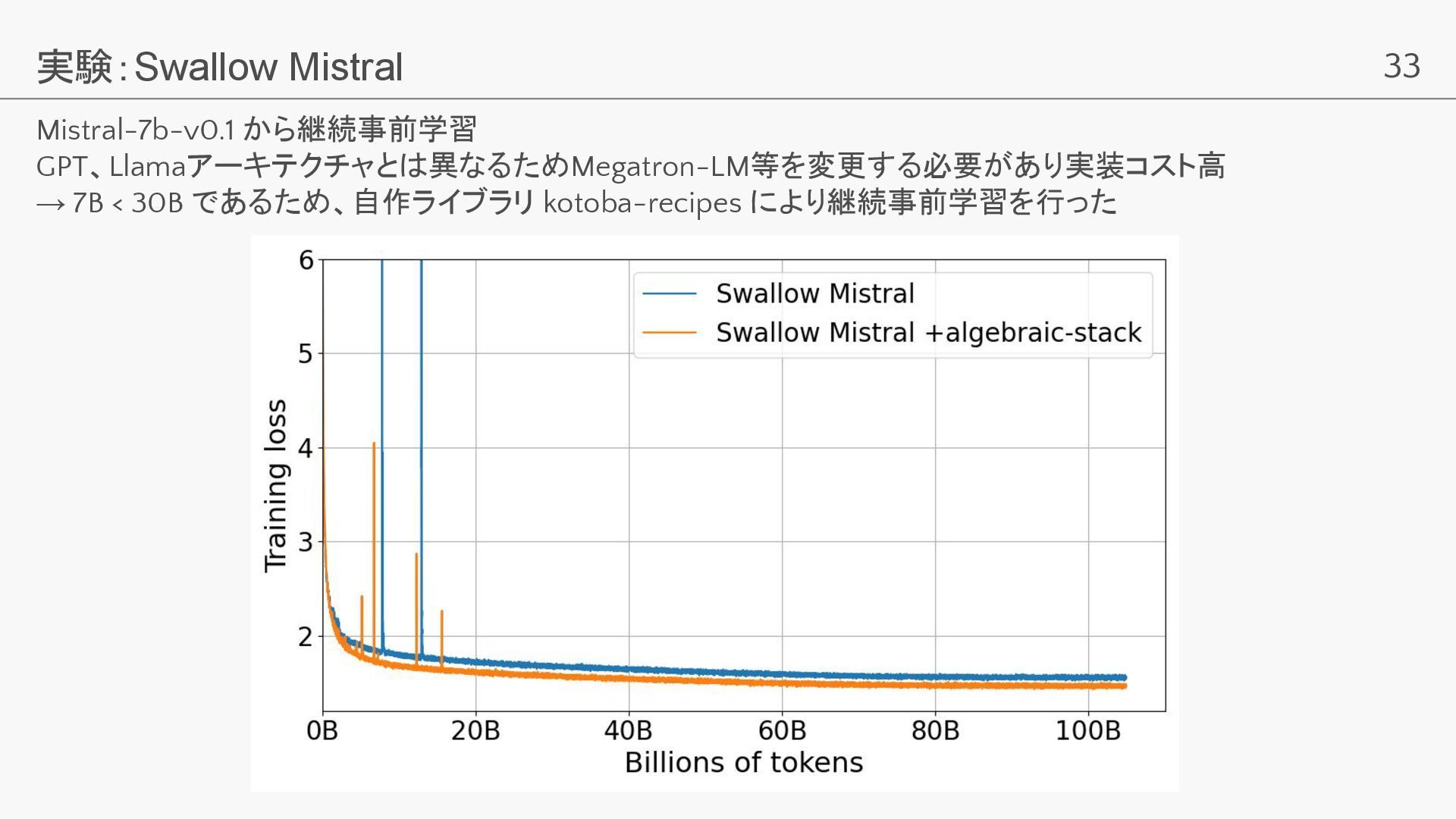 33 実験:Swallow Mistral Mistral-7b-v0.1 から継続事前学習 GPT、Llamaアーキテクチャとは異なるためMegatron-LM等を変更する必要があり実装コスト高 → 7B < 30B