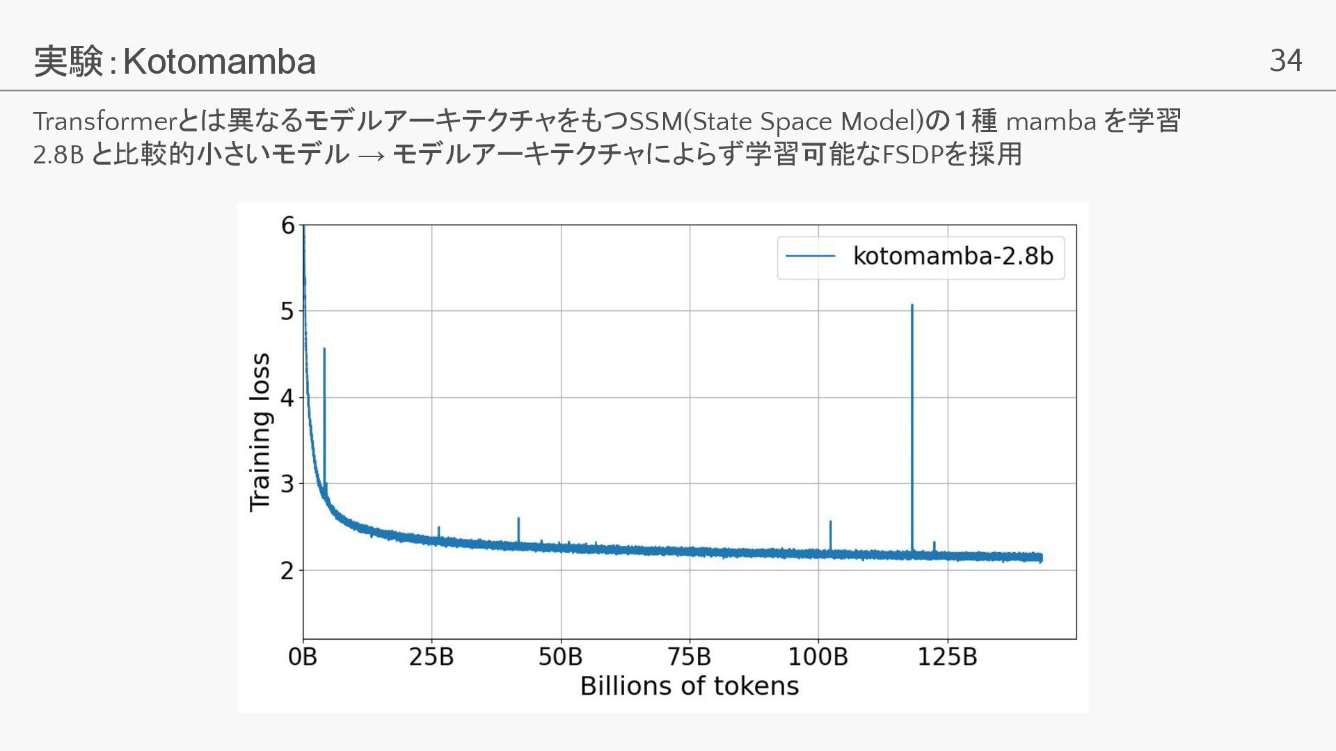 34 実験:Kotomamba Transformerとは異なるモデルアーキテクチャをもつSSM(State Space Model)の1種 mamba を学習 2.8B と比較的小さいモデル →