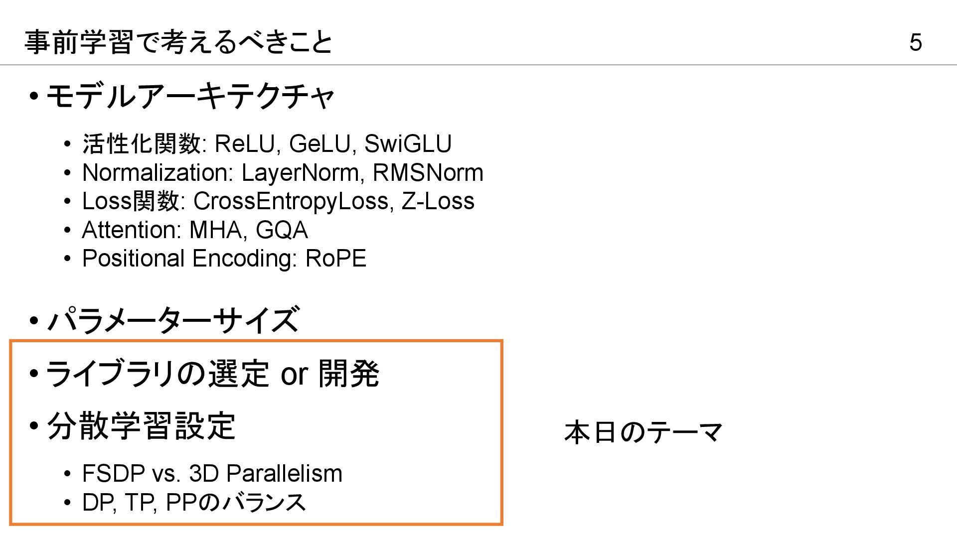 Normalization: LayerNorm, RMSNorm • Loss関数: CrossEntropyLoss, Z-Loss • Attention: MHA, GQA • Positional Encoding: RoPE • パラメーターサイズ • ライブラリの選定 or 開発 • 分散学習設定 • FSDP vs. 3D Parallelism • DP, TP, PPのバランス 本日のテーマ
