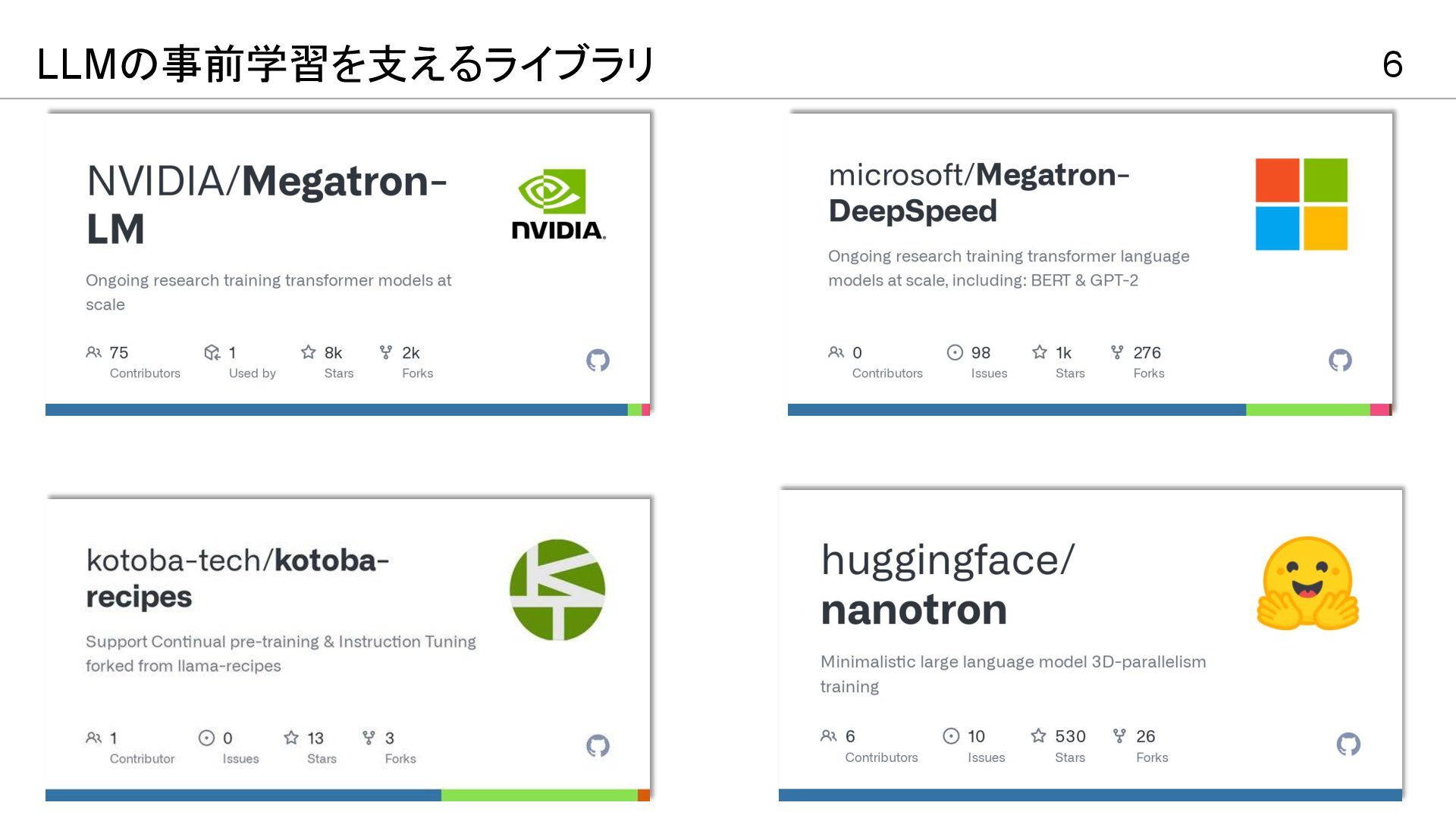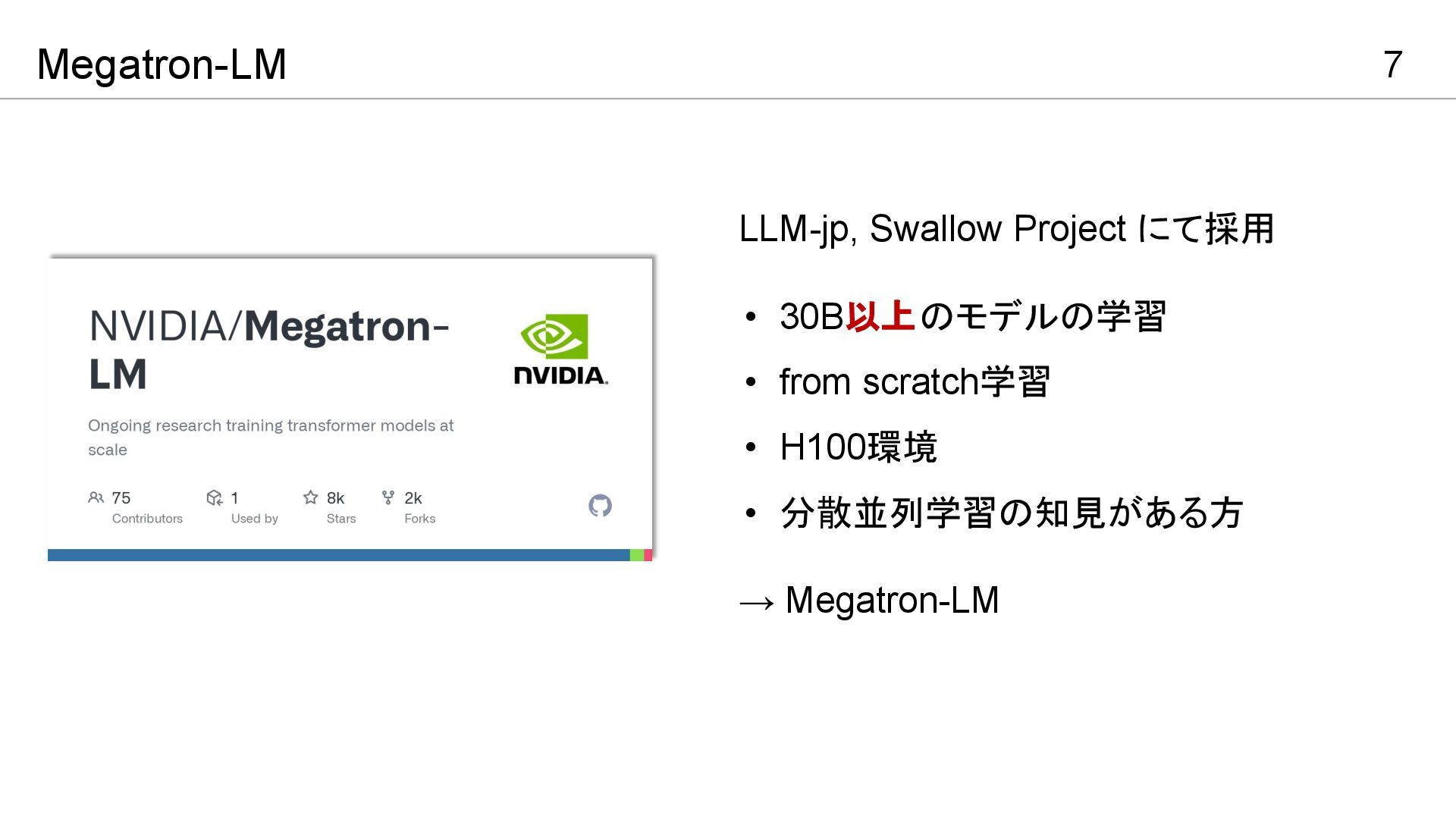 7 Megatron-LM LLM-jp, Swallow Project にて採用 • 30B以上のモデルの学習 • from