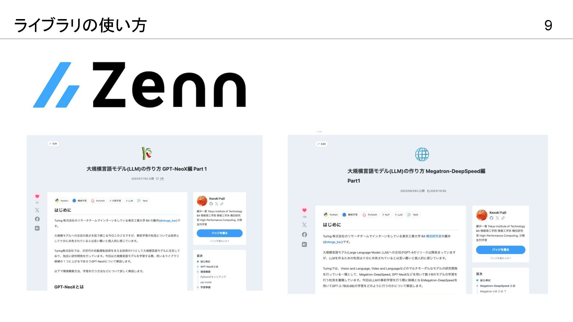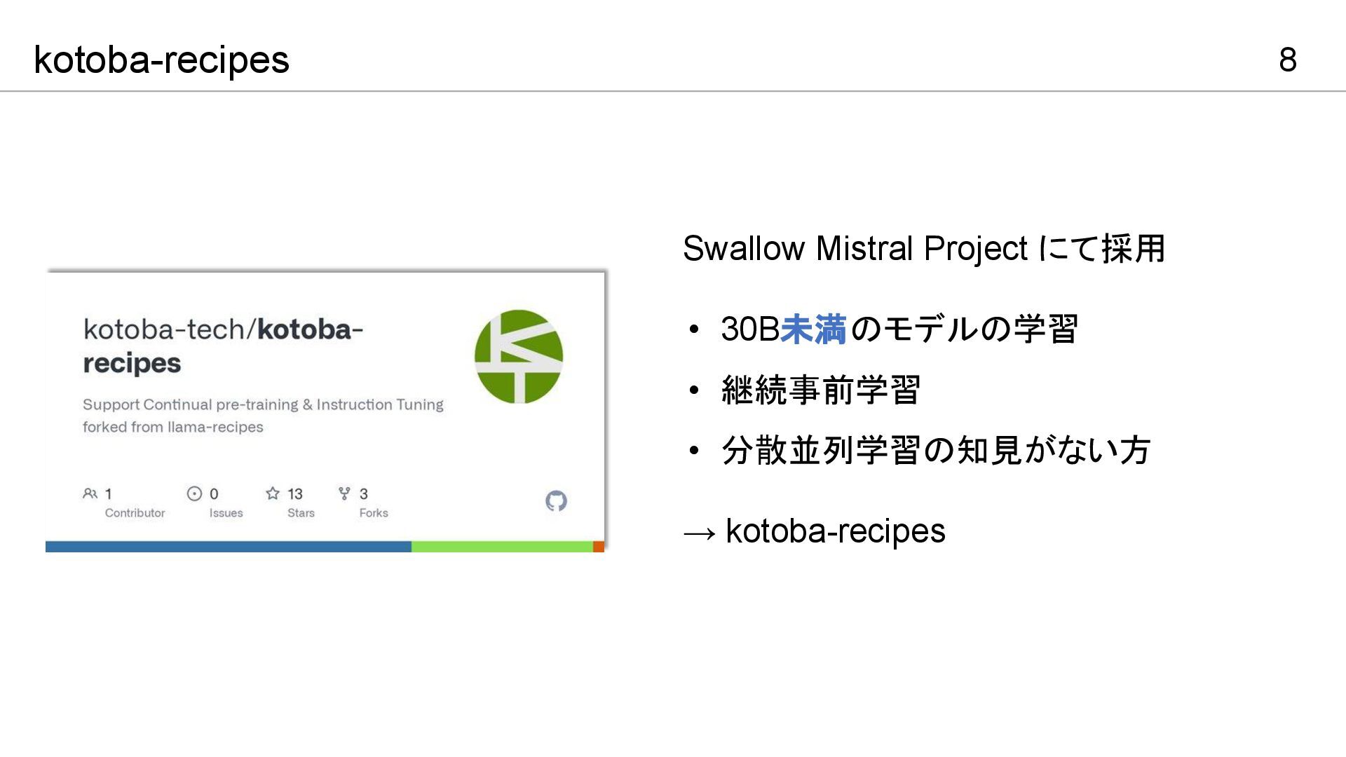 8 kotoba-recipes Swallow Mistral Project にて採用 • 30B未満のモデルの学習 • 継続事前学習