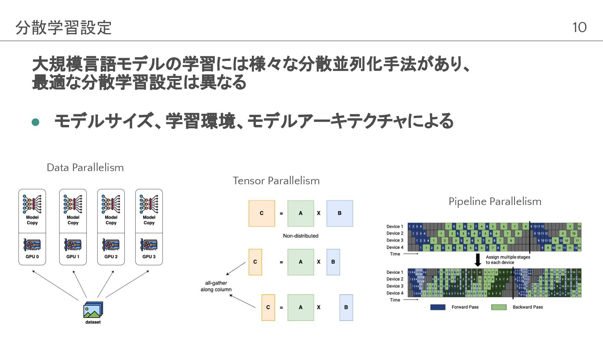 10 大規模言語モデルの学習には様々な分散並列化手法があり、 最適な分散学習設定は異なる • モデルサイズ、学習環境、モデルアーキテクチャによる 分散学習設定 Data Parallelism Tensor Parallelism