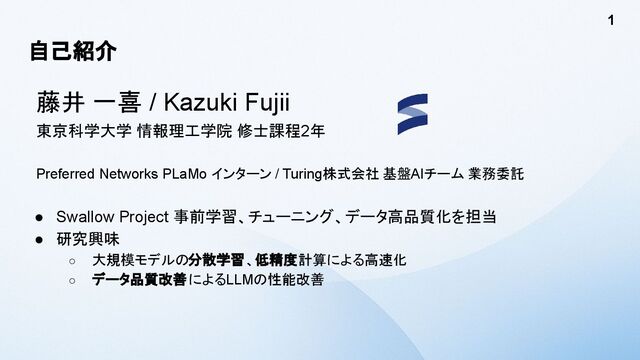 Networks PLaMo インターン / Turing株式会社 基盤AIチーム 業務委託 • Swallow Project 事前学習、チューニング、データ高品質化を担当 • 研究興味 ◦ 大規模モデルの分散学習、低精度計算による高速化 ◦ データ品質改善によるLLMの性能改善 1