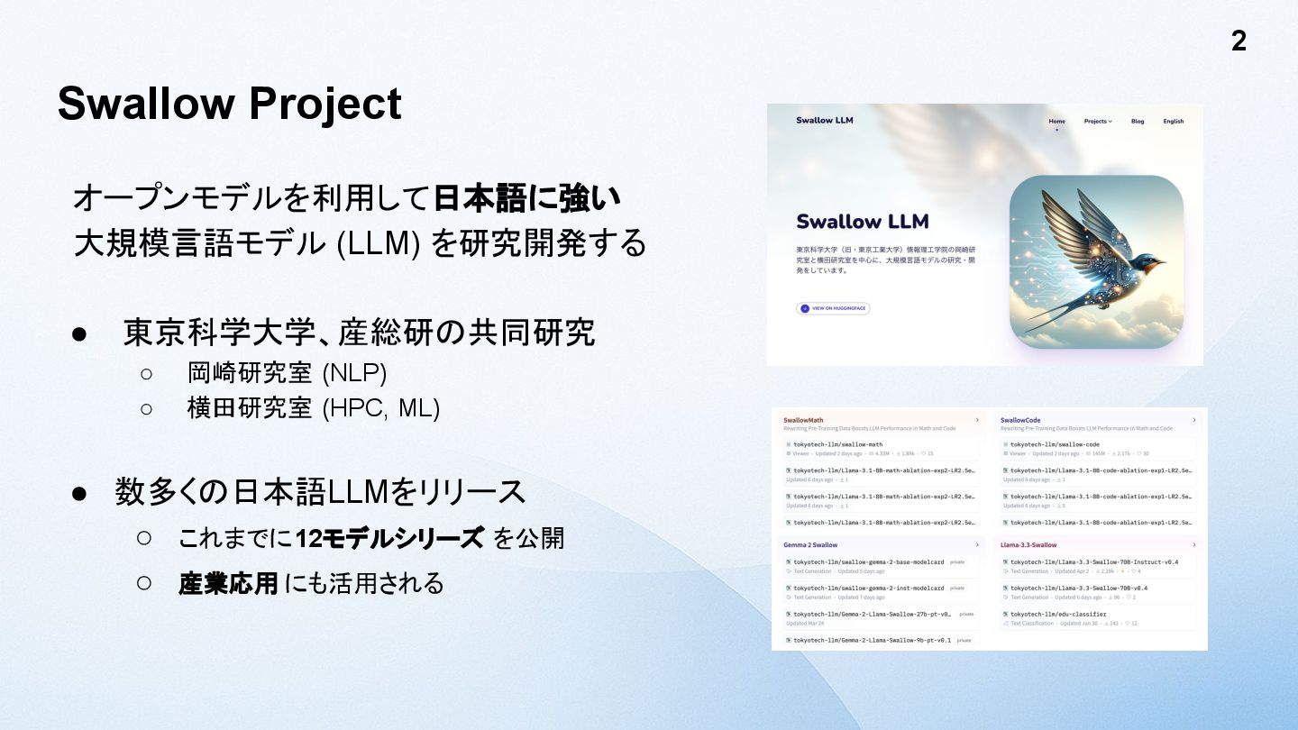 (NLP) ◦ 横田研究室 (HPC, ML) • 数多くの日本語LLMをリリース ◦ これまでに12モデルシリーズ を公開 ◦ 産業応用 にも活用される 2