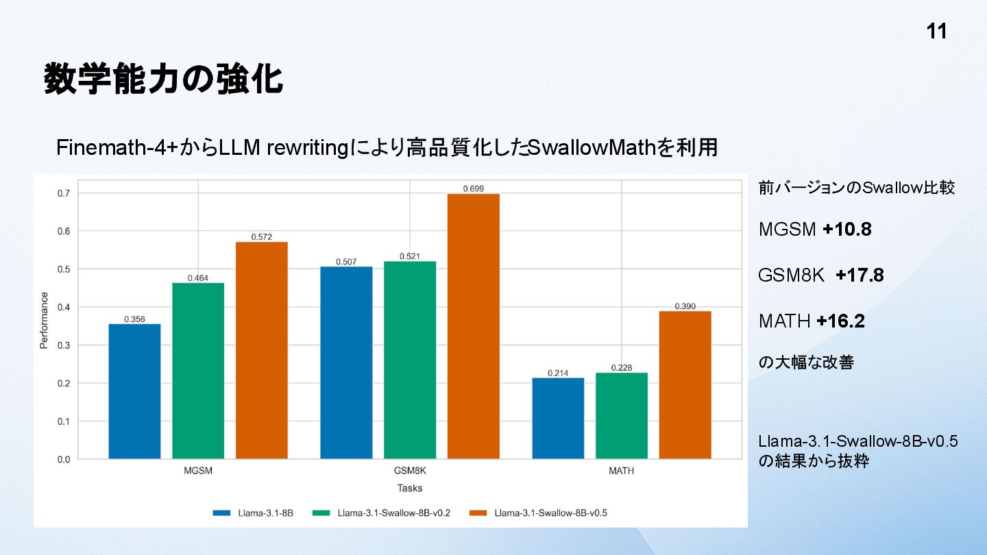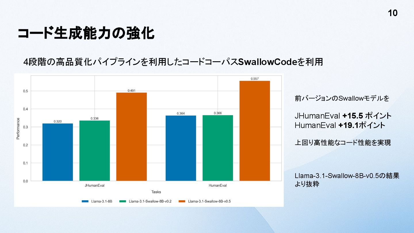 コード生成能力の強化 4段階の高品質化パイプラインを利用したコードコーパス SwallowCodeを利用 10 前バージョンのSwallowモデルを JHumanEval +15.5 ポイント HumanEval +19.1ポイント