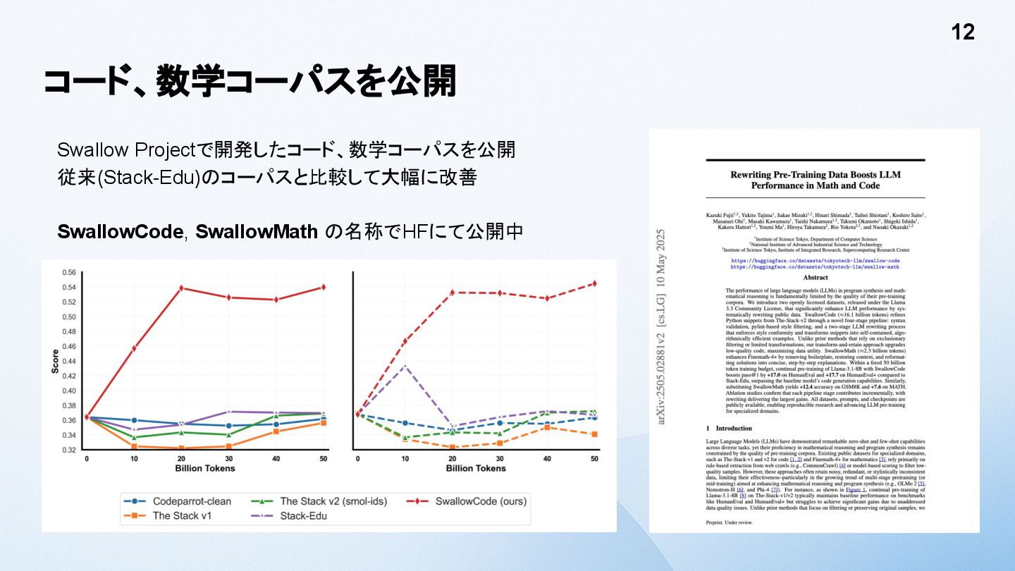 コード、数学コーパスを公開 Swallow Projectで開発したコード、数学コーパスを公開 従来(Stack-Edu)のコーパスと比較して大幅に改善 SwallowCode, SwallowMath の名称でHFにて公開中 12