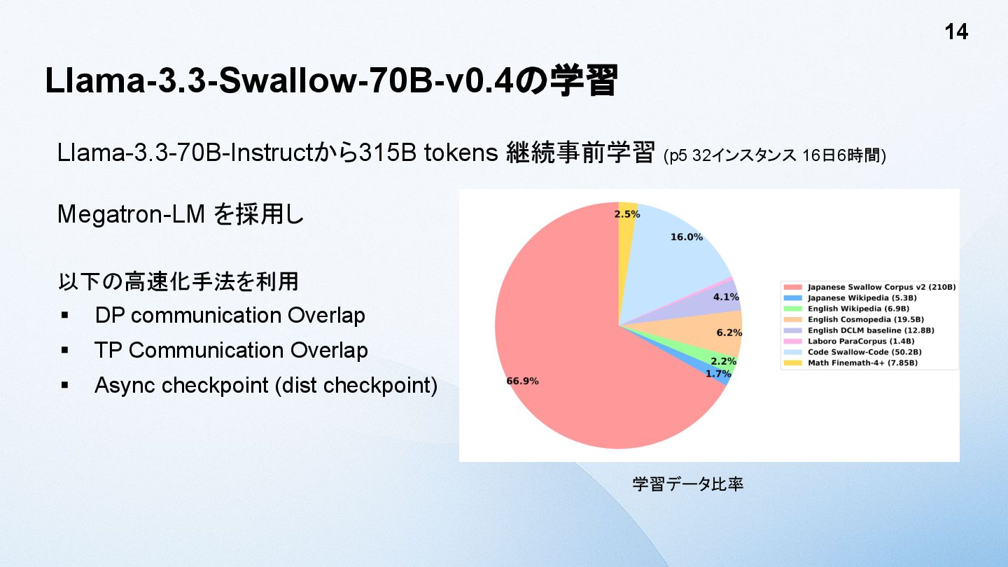 Swallow ProjectとAWS ▪ リリースモデルの学習 ▪ 学習データ、学習手法の検討は、大学の計算資源で行い大規模学習を AWS 等で実施 ▪ Llama-3.3-Swallow-70B-v0.4,
