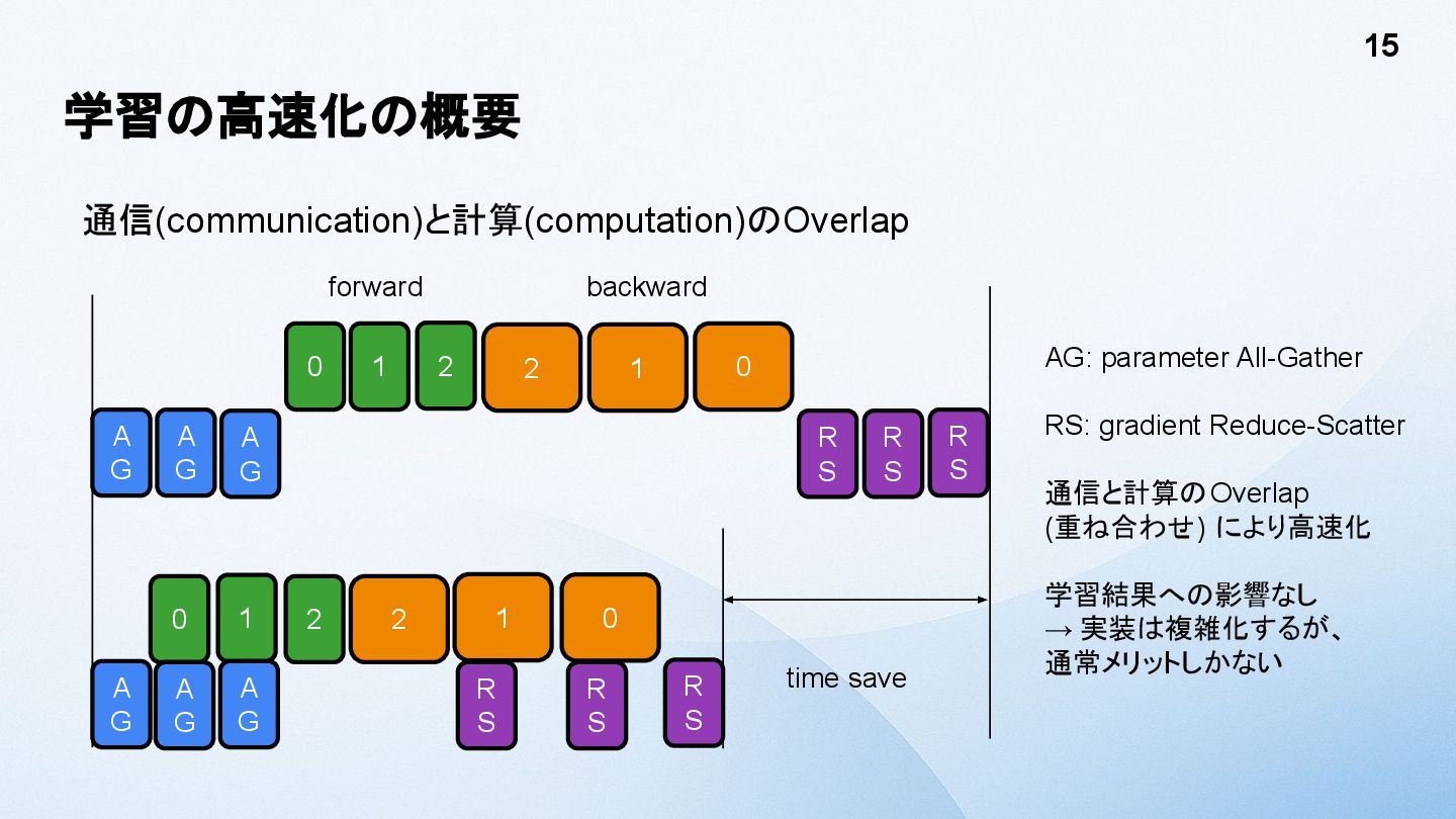 1 2 forward 2 1 0 R S R S R S backward A G 0 1 2 A G A G 2 R S 1 0 R S R S time save AG: parameter All-Gather RS: gradient Reduce-Scatter 通信と計算のOverlap (重ね合わせ) により高速化 学習結果への影響なし → 実装は複雑化するが、 通常メリットしかない