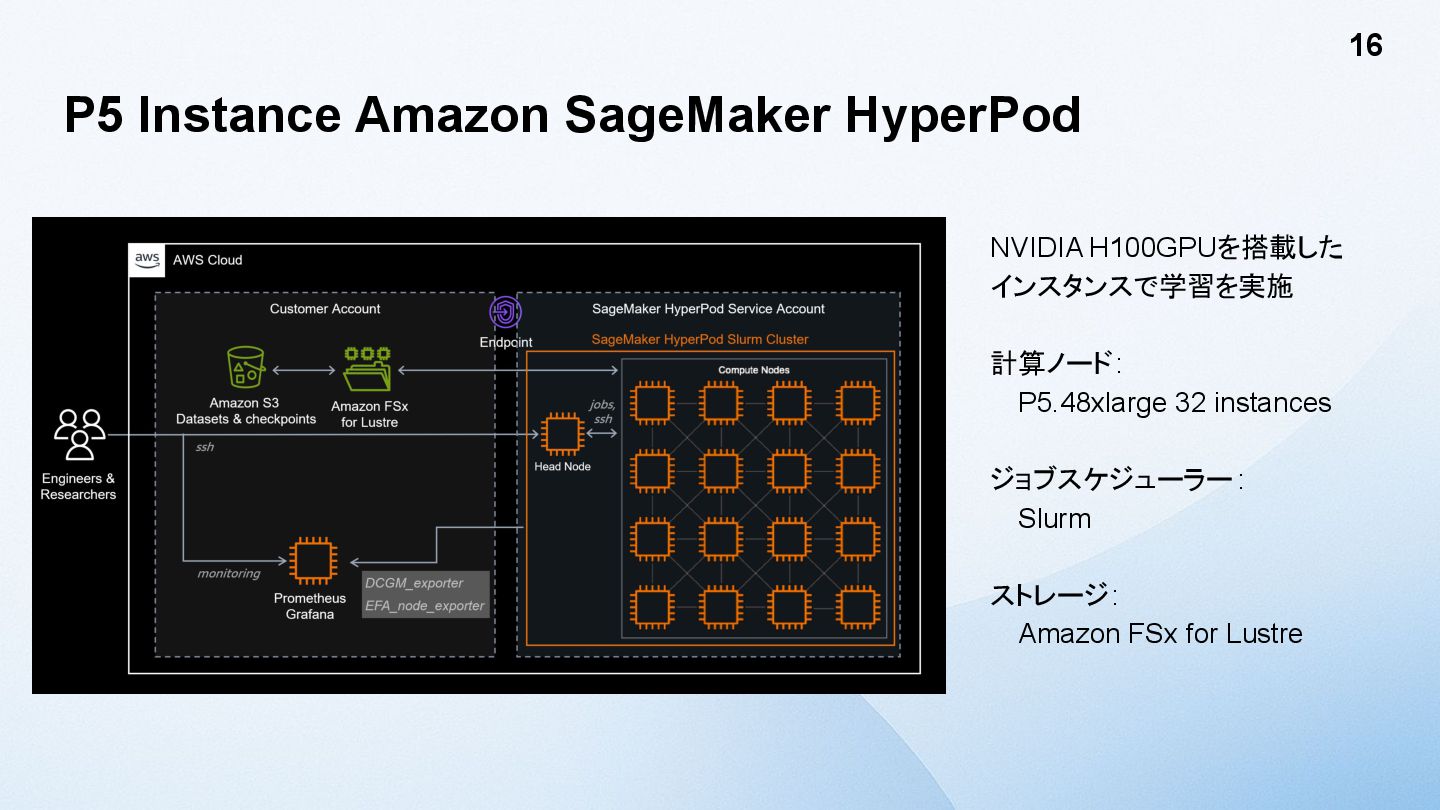 P5 Instance Amazon SageMaker HyperPod NVIDIA H100GPUを搭載した インスタンスで学習を実施 計算ノード: P5.48xlarge