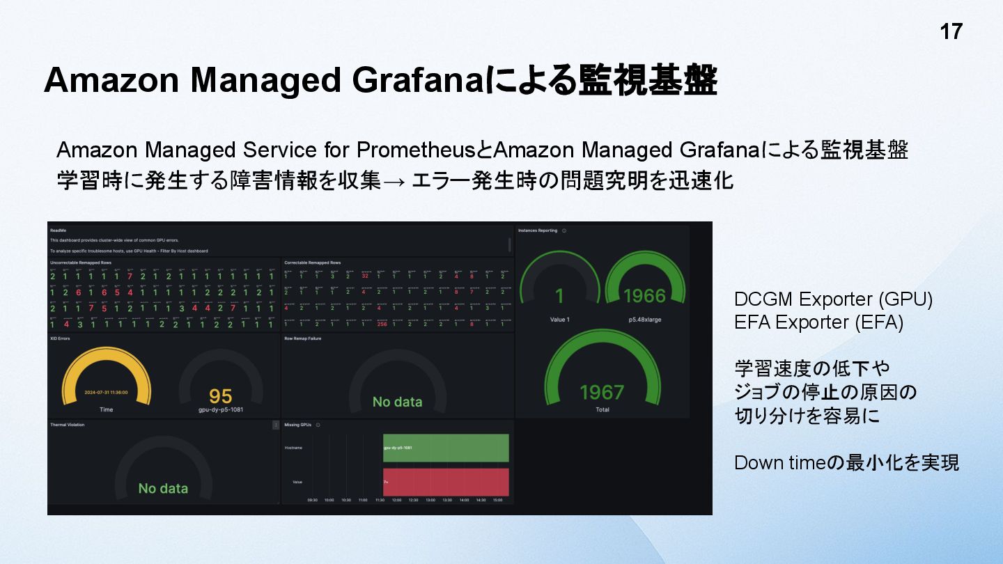 学習時に発生する障害情報を収集 → エラー発生時の問題究明を迅速化 17 DCGM Exporter (GPU) EFA Exporter (EFA) 学習速度の低下や ジョブの停止の原因の 切り分けを容易に Down timeの最小化を実現