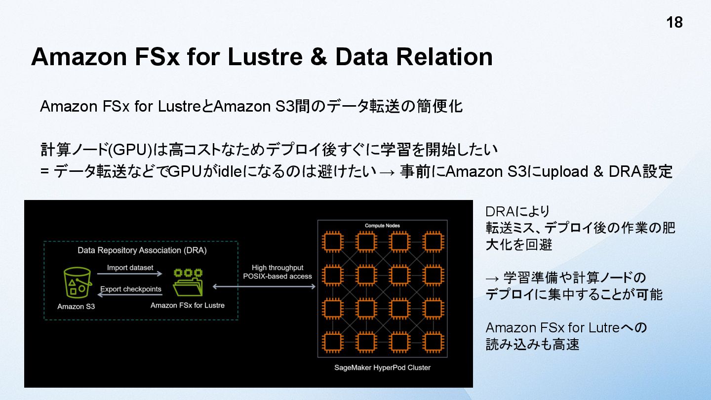 LustreとAmazon S3間のデータ転送の簡便化 計算ノード(GPU)は高コストなためデプロイ後すぐに学習を開始したい = データ転送などでGPUがidleになるのは避けたい → 事前にAmazon S3にupload & DRA設定 18 DRAにより 転送ミス、デプロイ後の作業の肥 大化を回避 → 学習準備や計算ノードの デプロイに集中することが可能 Amazon FSx for Lutreへの 読み込みも高速