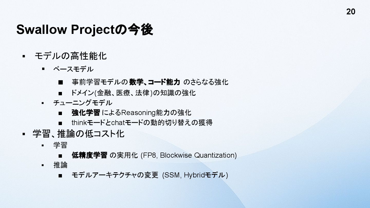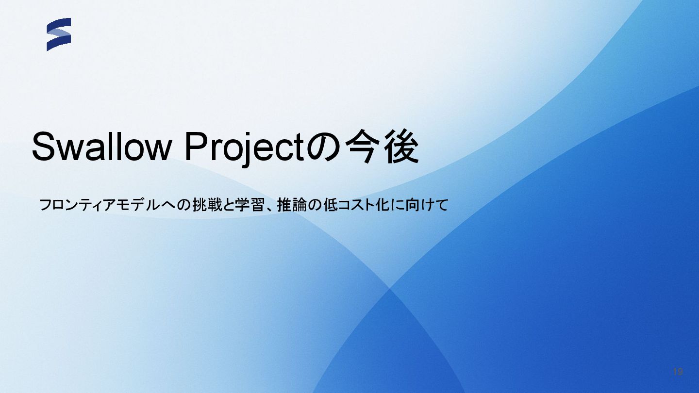 Swallow Projectの今後 フロンティアモデルへの挑戦と学習、推論の低コスト化に向けて 19