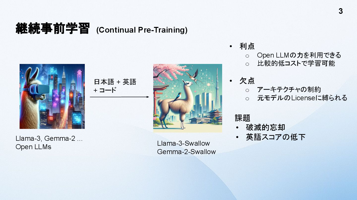 継続事前学習 (Continual Pre-Training) 3 Llama-3, Gemma-2 ... Open LLMs 日本語