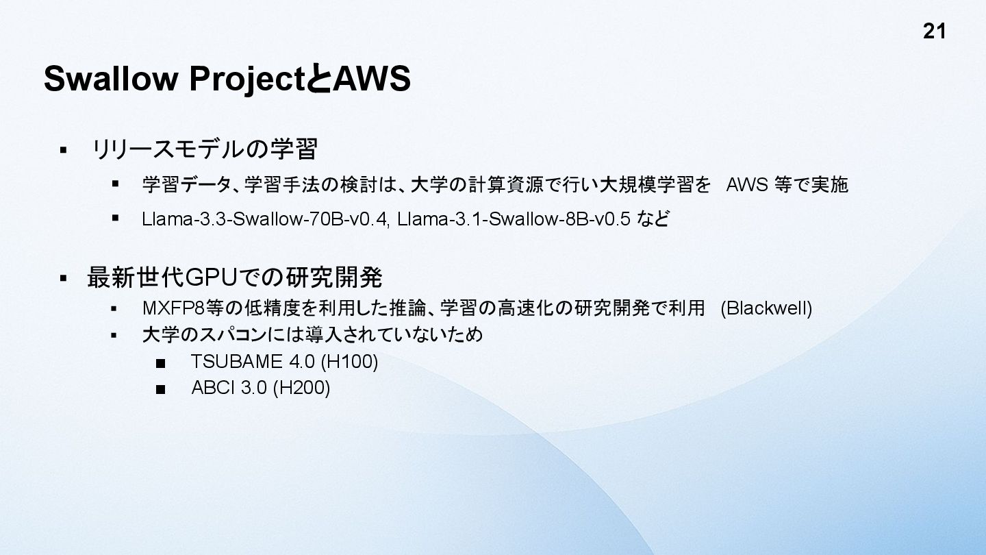 Llama-3.1-Swallow-8B-v0.5 など ▪ 最新世代GPUでの研究開発 ▪ MXFP8等の低精度を利用した推論、学習の高速化の研究開発で利用 (Blackwell) ▪ 大学のスパコンには導入されていないため ▪ TSUBAME 4.0 (H100) ▪ ABCI 3.0 (H200) 21
