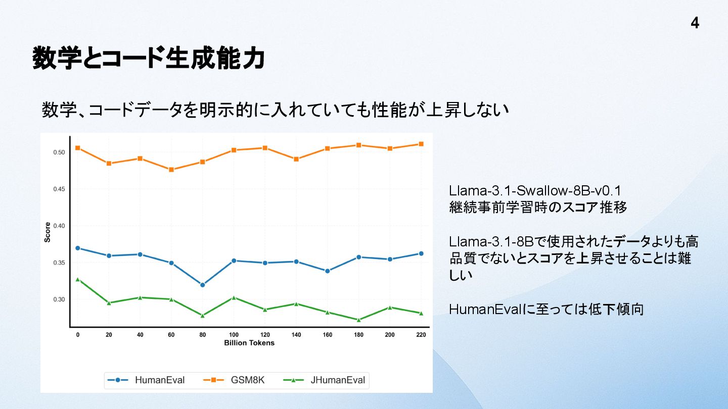 数学とコード生成能力 数学、コードデータを明示的に入れていても性能が上昇しない 4 Llama-3.1-Swallow-8B-v0.1 継続事前学習時のスコア推移 Llama-3.1-8Bで使用されたデータよりも高 品質でないとスコアを上昇させることは難 しい HumanEvalに至っては低下傾向