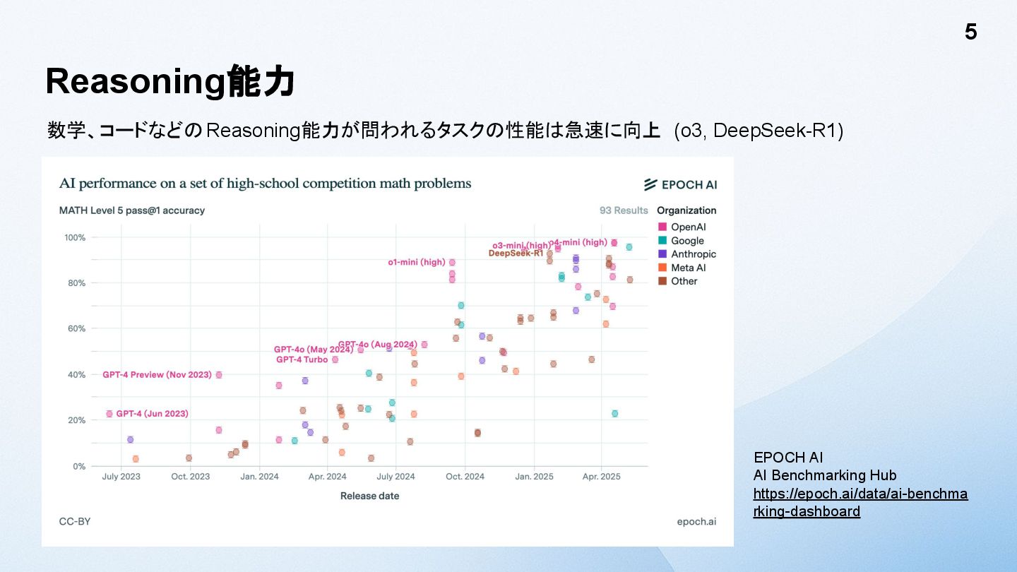 Reasoning能力 数学、コードなどのReasoning能力が問われるタスクの性能は急速に向上 (o3, DeepSeek-R1) 5 EPOCH AI AI Benchmarking Hub
