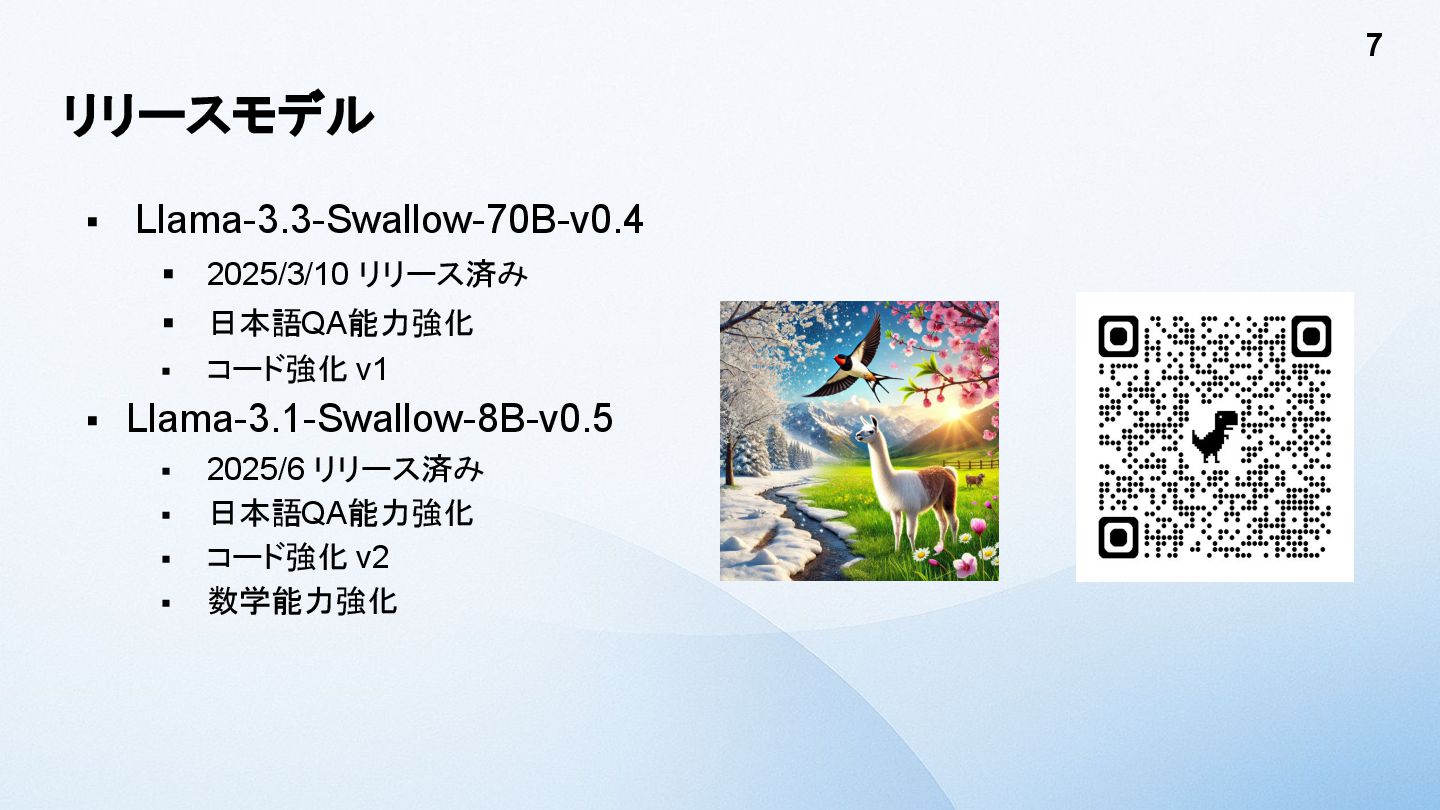 v1 ▪ Llama-3.1-Swallow-8B-v0.5 ▪ 2025/6 リリース済み ▪ 日本語QA能力強化 ▪ コード強化 v2 ▪ 数学能力強化 7