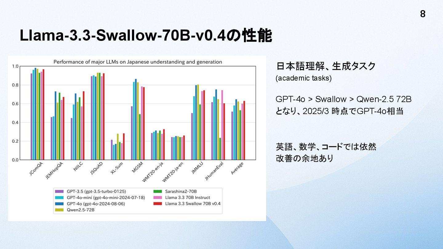 となり、2025/3 時点でGPT-4o相当 英語、数学、コードでは依然 改善の余地あり 8