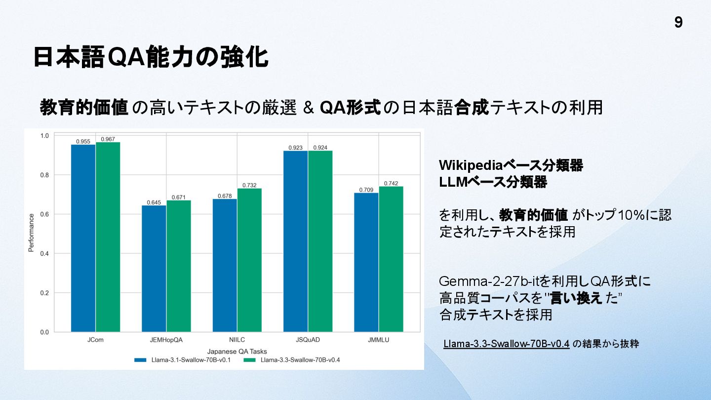 定されたテキストを採用 Gemma-2-27b-itを利用しQA形式に 高品質コーパスを"言い換え た” 合成テキストを採用 Llama-3.3-Swallow-70B-v0.4 の結果から抜粋