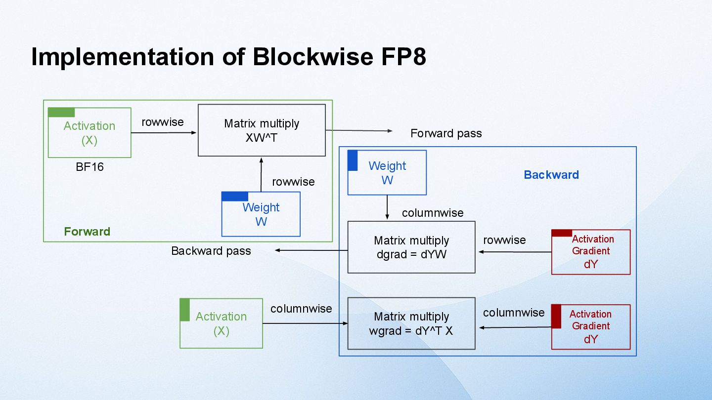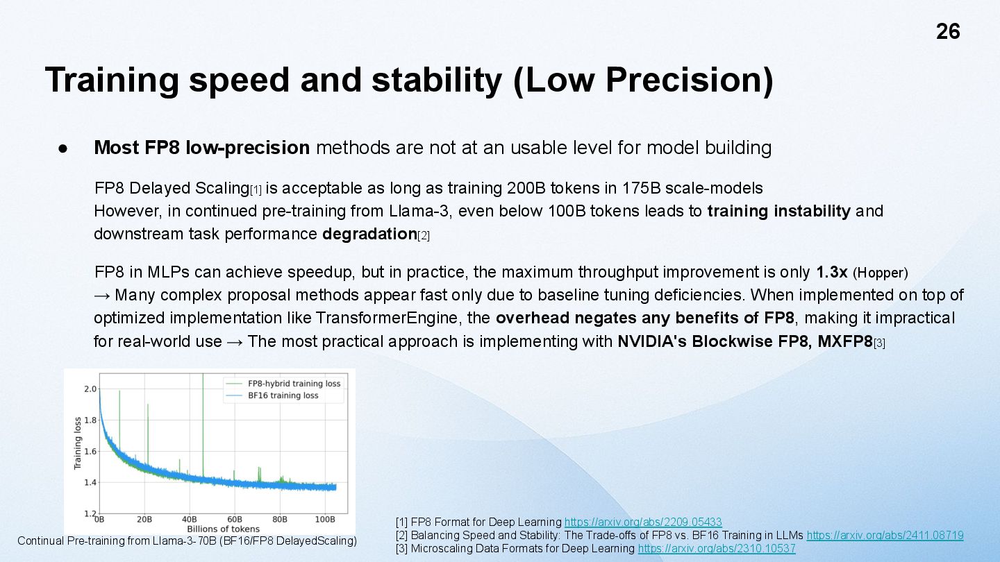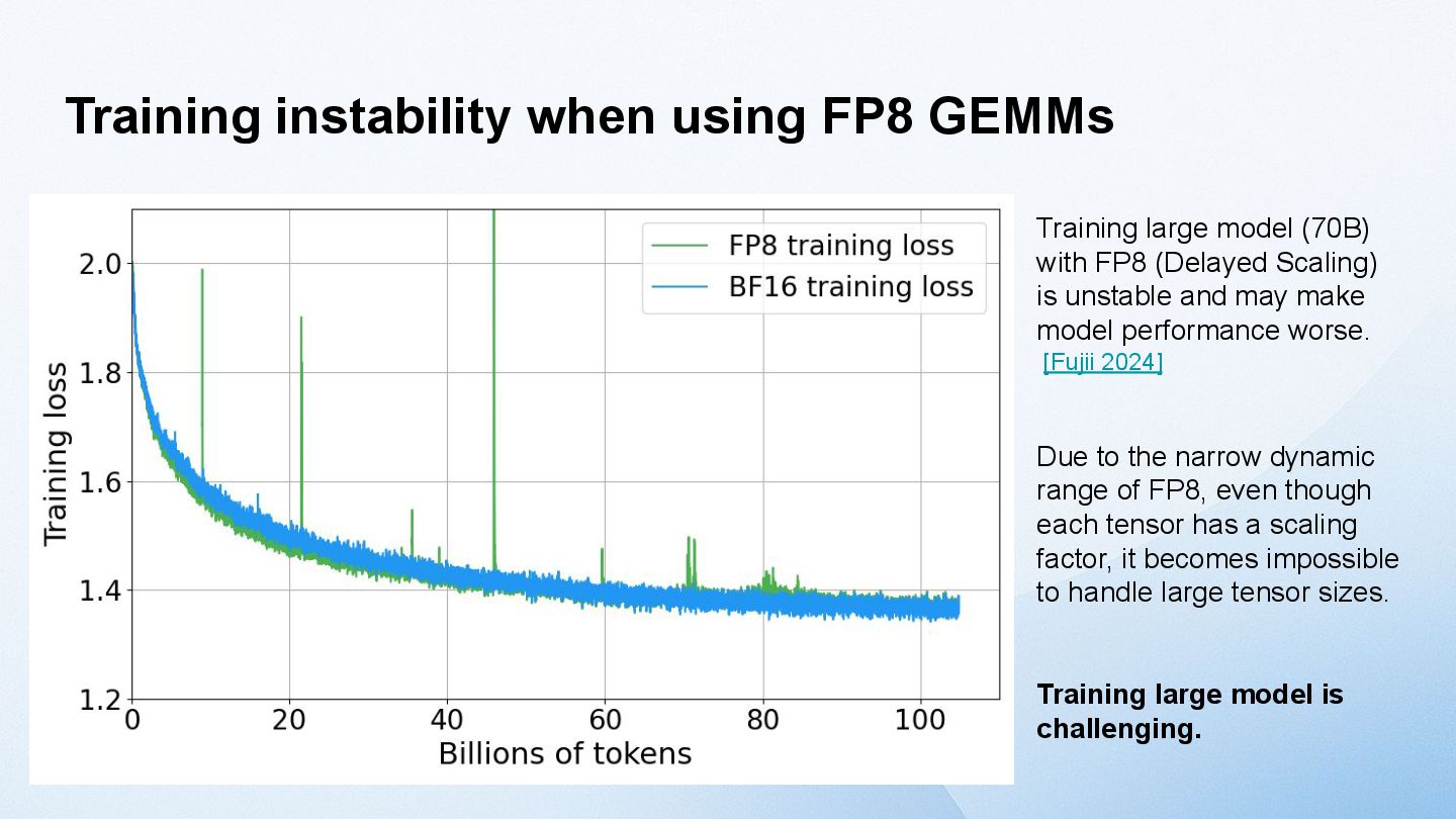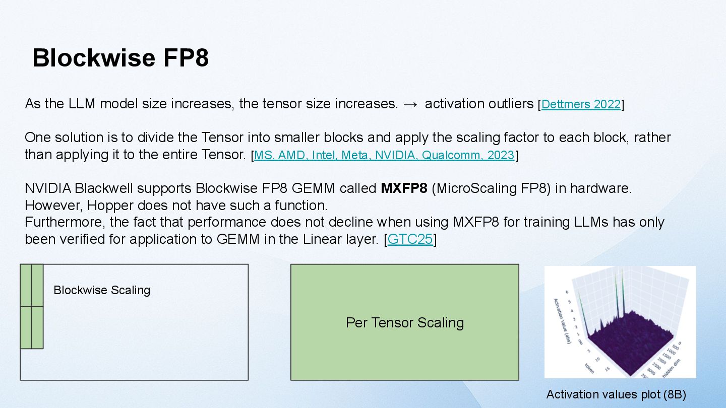 model size increases, the tensor size increases. → activation outliers [Dettmers 2022] One solution is to divide the Tensor into smaller blocks and apply the scaling factor to each block, rather than applying it to the entire Tensor. [MS, AMD, Intel, Meta, NVIDIA, Qualcomm, 2023] NVIDIA Blackwell supports Blockwise FP8 GEMM called MXFP8 (MicroScaling FP8) in hardware. However, Hopper does not have such a function. Furthermore, the fact that performance does not decline when using MXFP8 for training LLMs has only been verified for application to GEMM in the Linear layer. [GTC25] Activation values plot (8B)